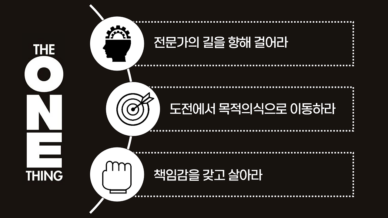작가는 단 하나를 위해 다음 3가지를 지키며 살아갈 것을 제안한다. '전문가의 길을 향해 걸어라', '도전에서 목적의식으로 이동하라' '책임감을 갖고 살아라' 모두 한번쯤은 들어본 식상한 말일지도 모른다. 하지만 작가는 자세하게 실천할 수 있는 구체적인 사례들을 제시하며 독자들을 독려한다.