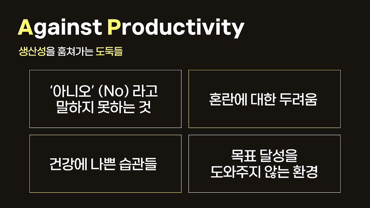 위 사진은 내가 직접 만든 것―검은 색 배경의 인포그래픽들은 전부 내가 만든 것이다.―으로, 책상 앞에 써붙이고 있다는 작가의 행동을 본받아 만든 것이다.