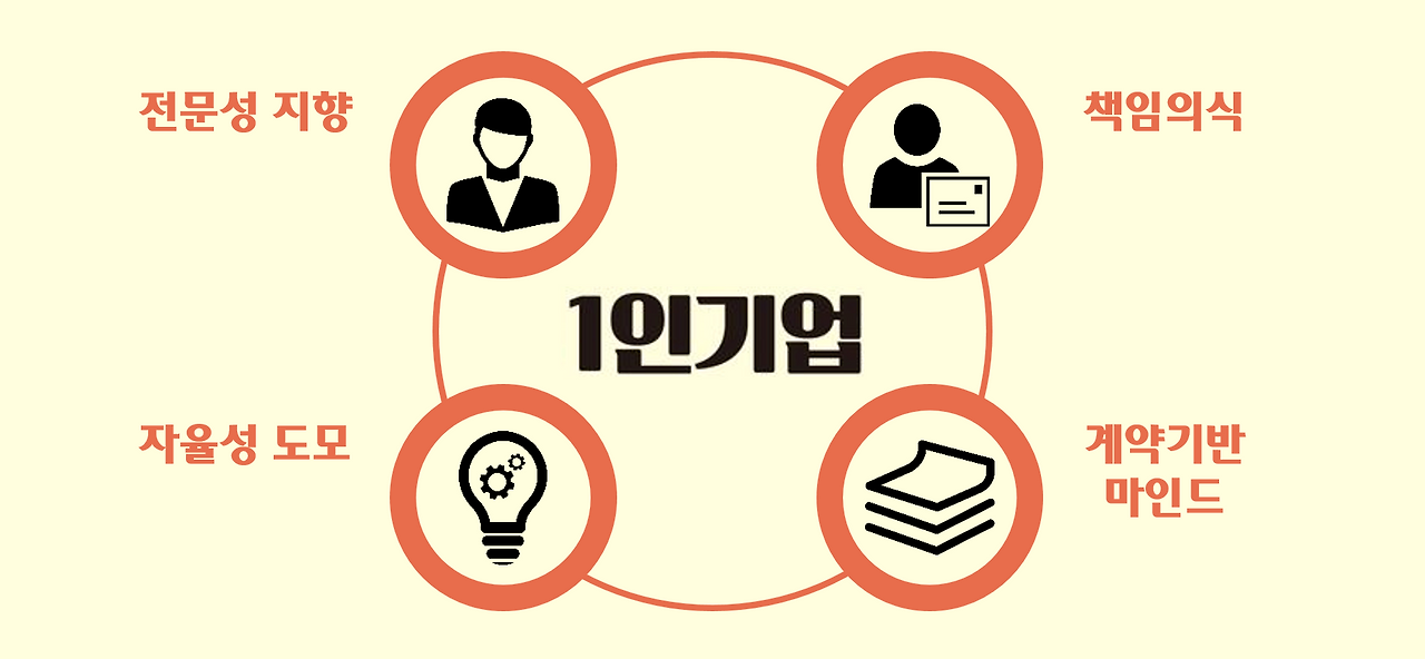 저자는 1인기업은 일에 대한 전문성과 책임의식을 지향해야 한다고 말한다. 그 외에도 1인기업의 장점이라고 할 수 있는 자율성과 창의성을 놓치지 않을 것과 법적인 문제에서 도움이 될 수 있는 계약 기반 마인드를 강조한다.