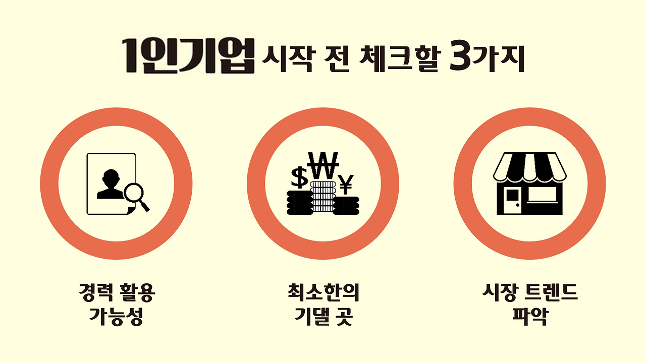 그 중 몇 가지 핵심 포인트들을 가져와 인포그래픽으로 정리해보았다. 작가님은 그동안 해왔던 일들을 실질적으로 나의 경력으로 활용할 수 있는지, 당분간 수입이 없더라도 최소한의 기댈 곳이 있는지, 내가 들어갈 시장의 현재 트렌드를 제대로 파악하고 있는지, 1인 기업을 시작하기 전 이 3가지를 먼저 살펴볼 것을 당부한다.