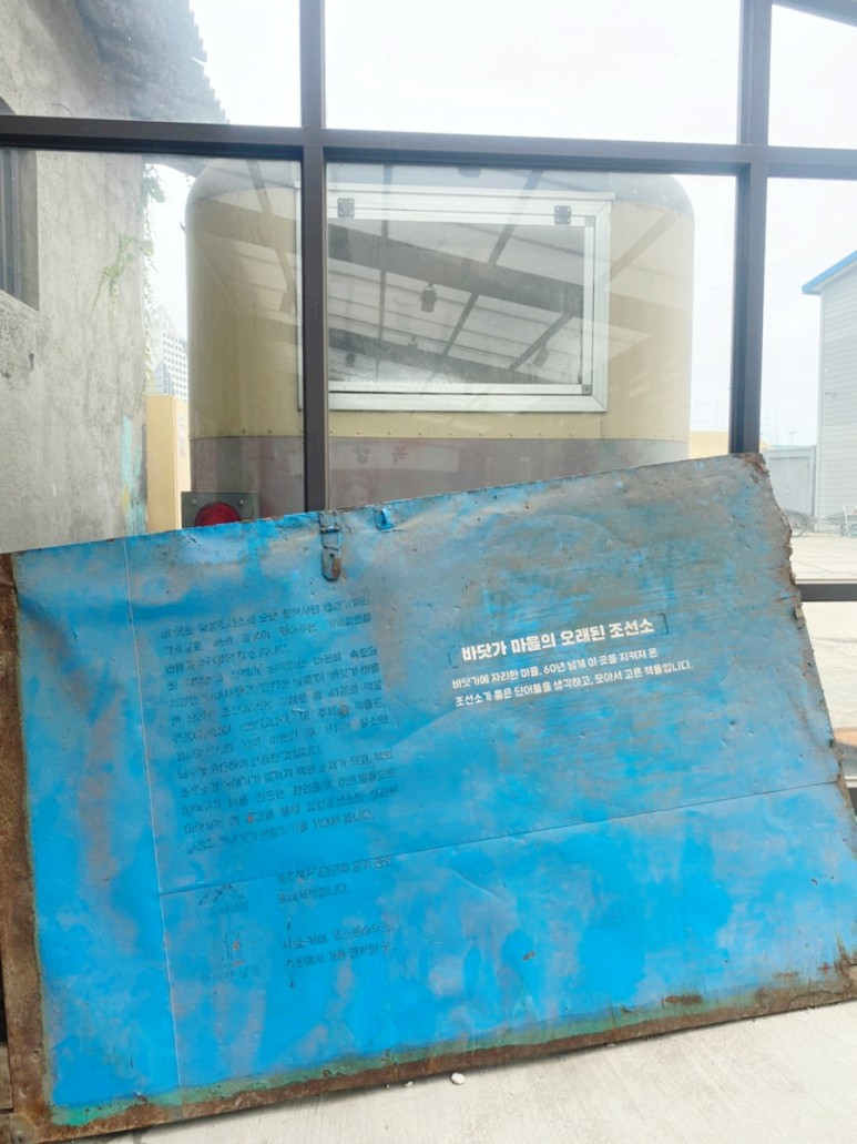 넓게 펼쳐진 파란색 위의 흰 글씨로 쓰여 있는 '바닷가 마을의 오래된 조선소'라고 소개하는 문장을 읽는데 말로 설명하기 힘든 뭉클함이 있었다. 60년이 넘는 세월 동안 이곳에서 배를 수리하고 만들었을 분들의 이야기가 궁금해졌다. 그들이 살아온 삶 그 자체가 아름다움으로 내 마음에 닿은 것이다. 그런 인간적인 호기심과 흥미로움이 가득했던 공간, 인상적일 수밖에 없었다.