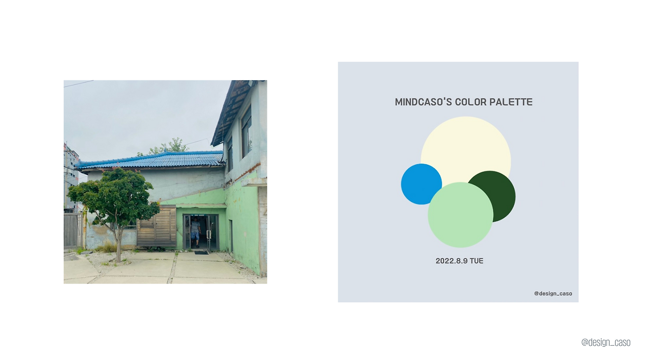 입구 쪽의 채도, 즉 컬러의 선명도가 낮은 그레이와 건물 한 면의 에메랄드빛 페인팅 그리고 파란색 지붕, 그 앞에 서 있는 푸른 나무 한 그루가 그려낸 배색 역시 내게 잊지 못할 인상을 남겼다.