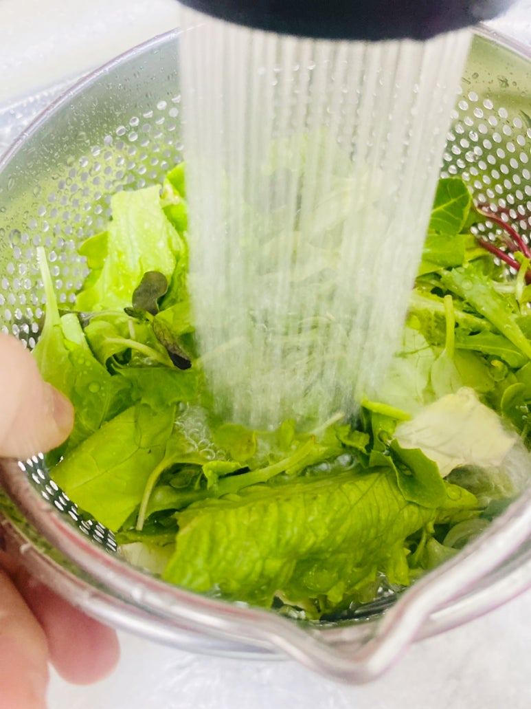 1. 채소와 과일 등 샐러드에 넣을 재료를 먼저 흐르는 찬물에 깨끗하게 씻어서 스텐 볼에 담아둔다.