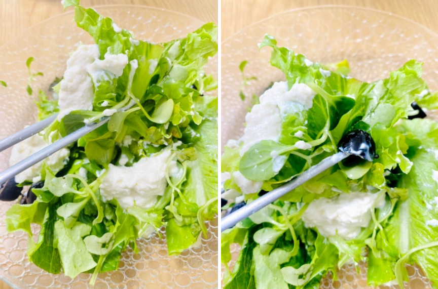 4. 깨끗하게 씻은 야채 위에 올리브 썰어서 얹어주고, 두부크림소스도 얹는다.