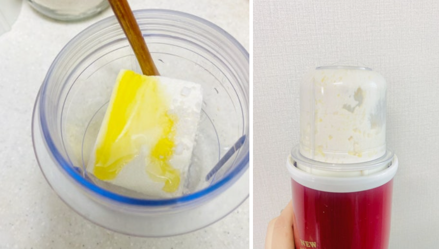 두부 1/4에 올리브유 휘릭 두르고 소금 한 1스푼 넣은 뒤, 믹서기에 휙! 갈아버린다.