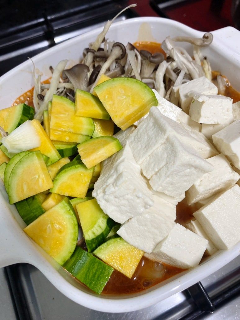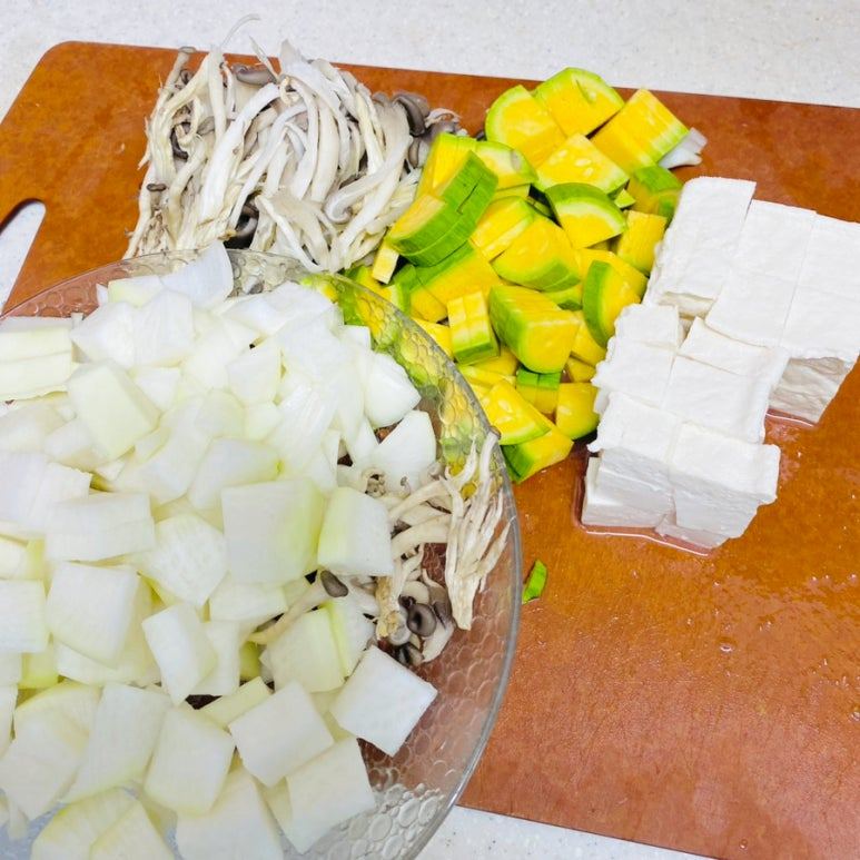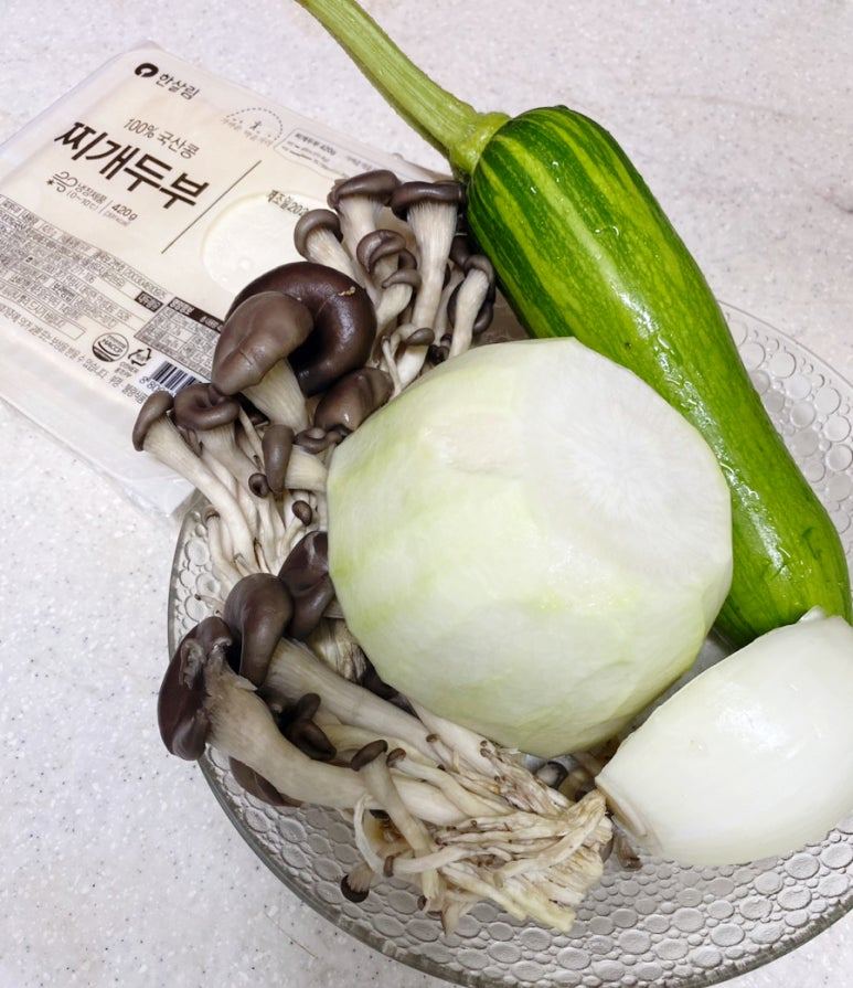 1. 야채와 두부 등 재료들을 흐르는 물에 씻은 뒤 먹기 좋은 크기로 손질한다.