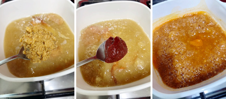 3. 채수가 우러나고 보글보글 끓으면, 된장과 고추장을 같이 풀어준다.