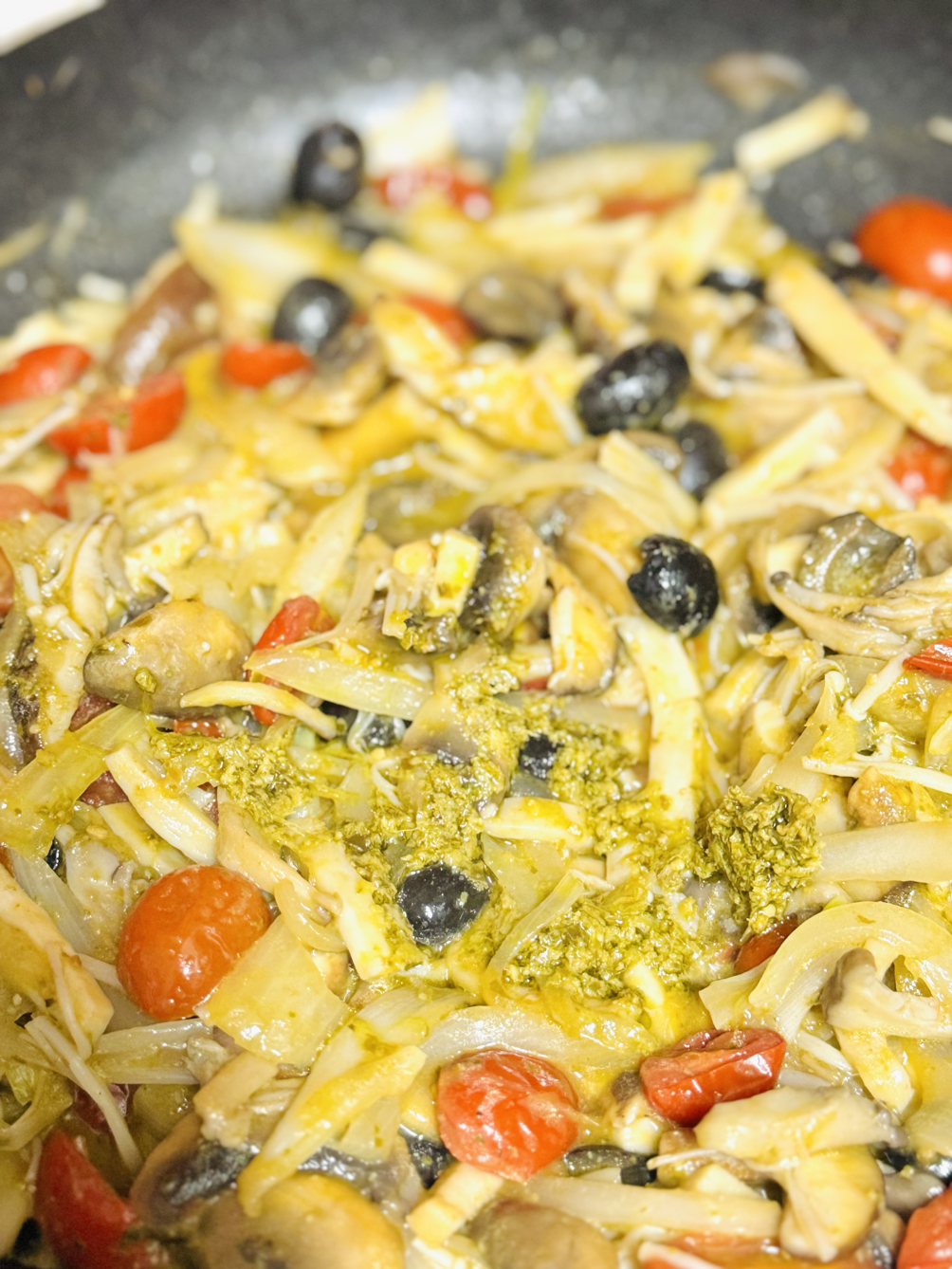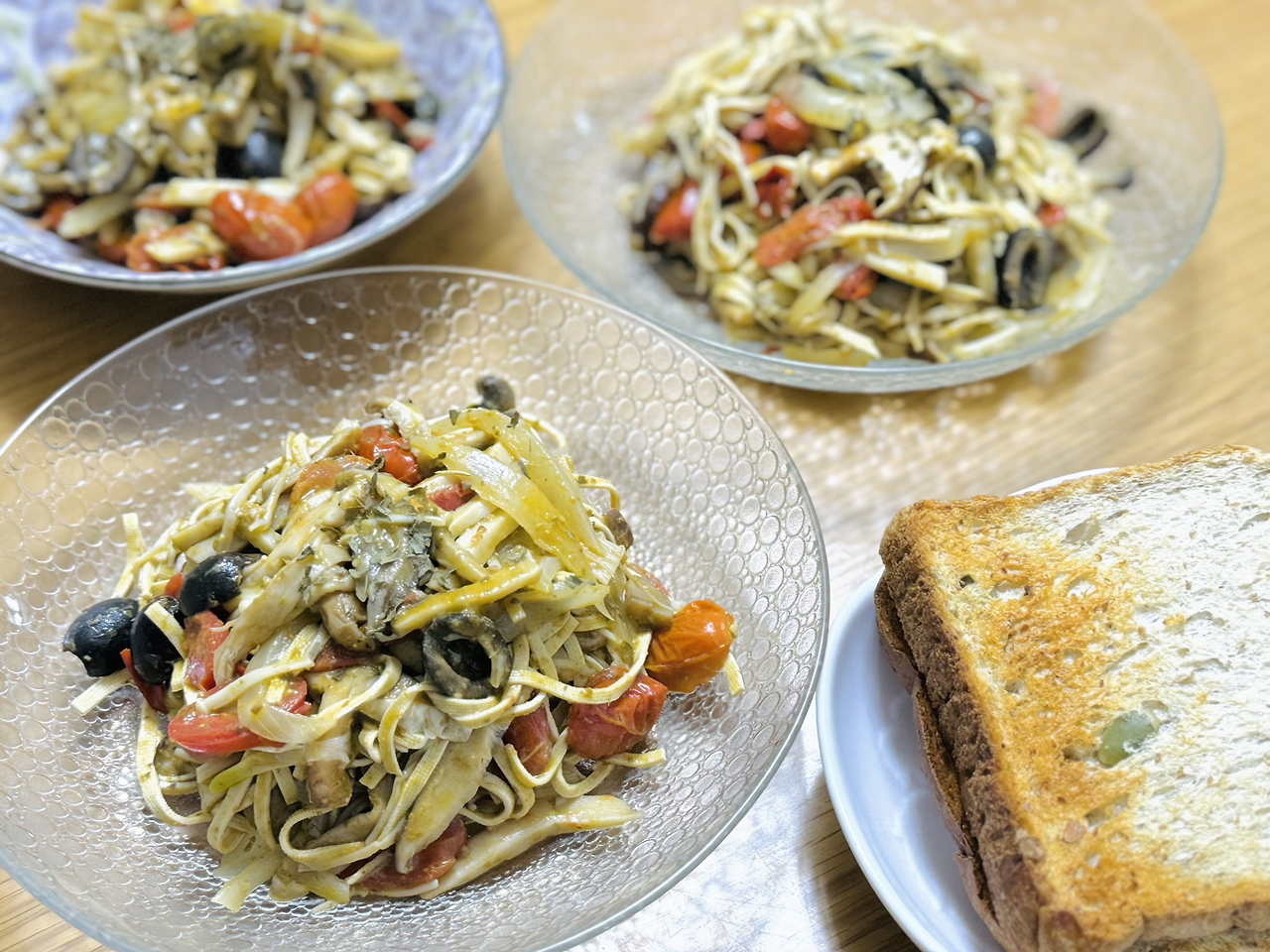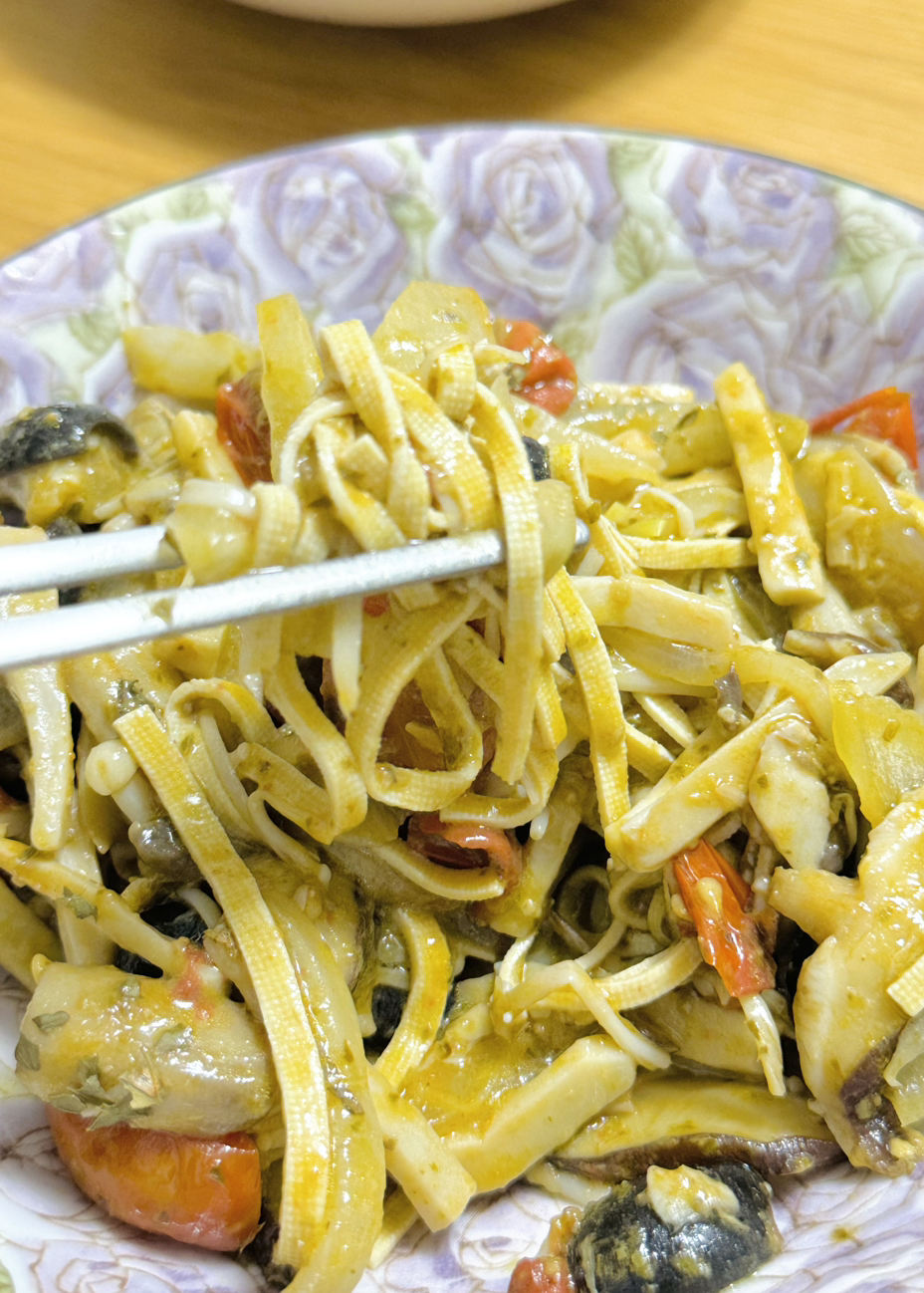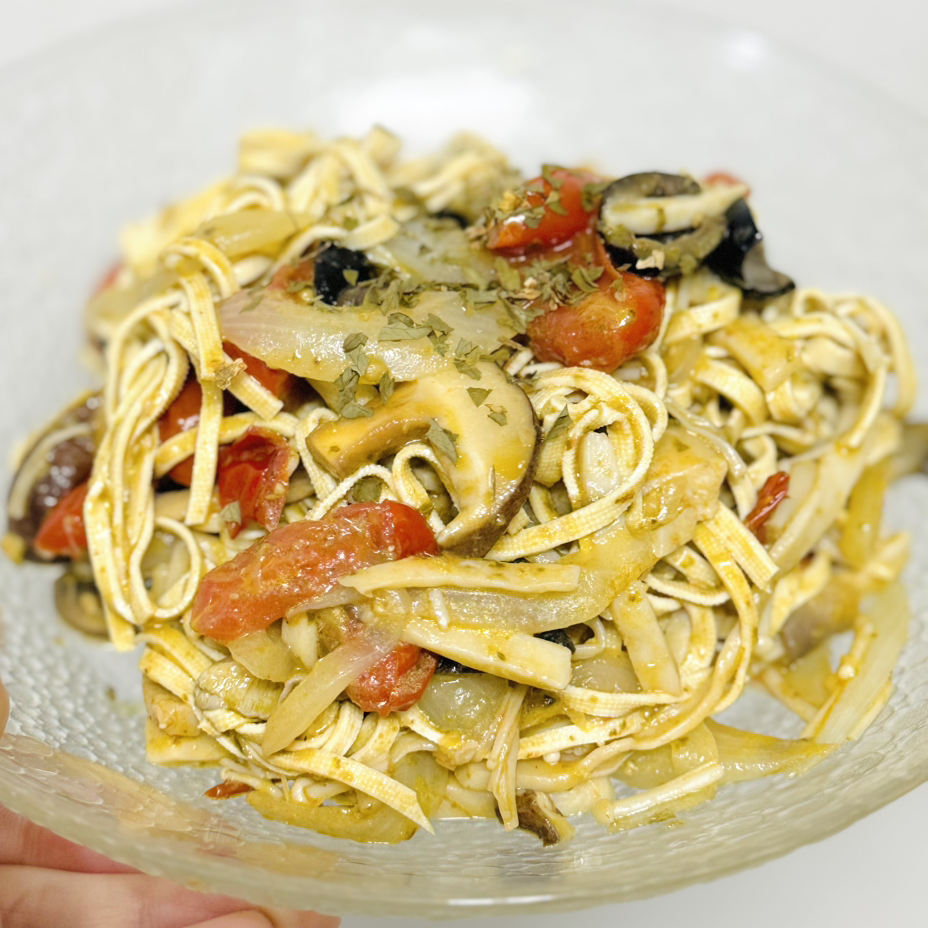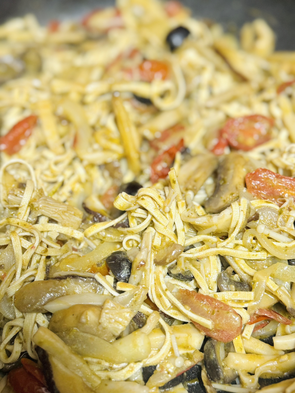 동물성 재료는 하나도 넣지 않고 완성한 바질페스토버섯파스타, 두부면이 어찌나 가벼운지, 속이 편하다는 느낌이 들었다.