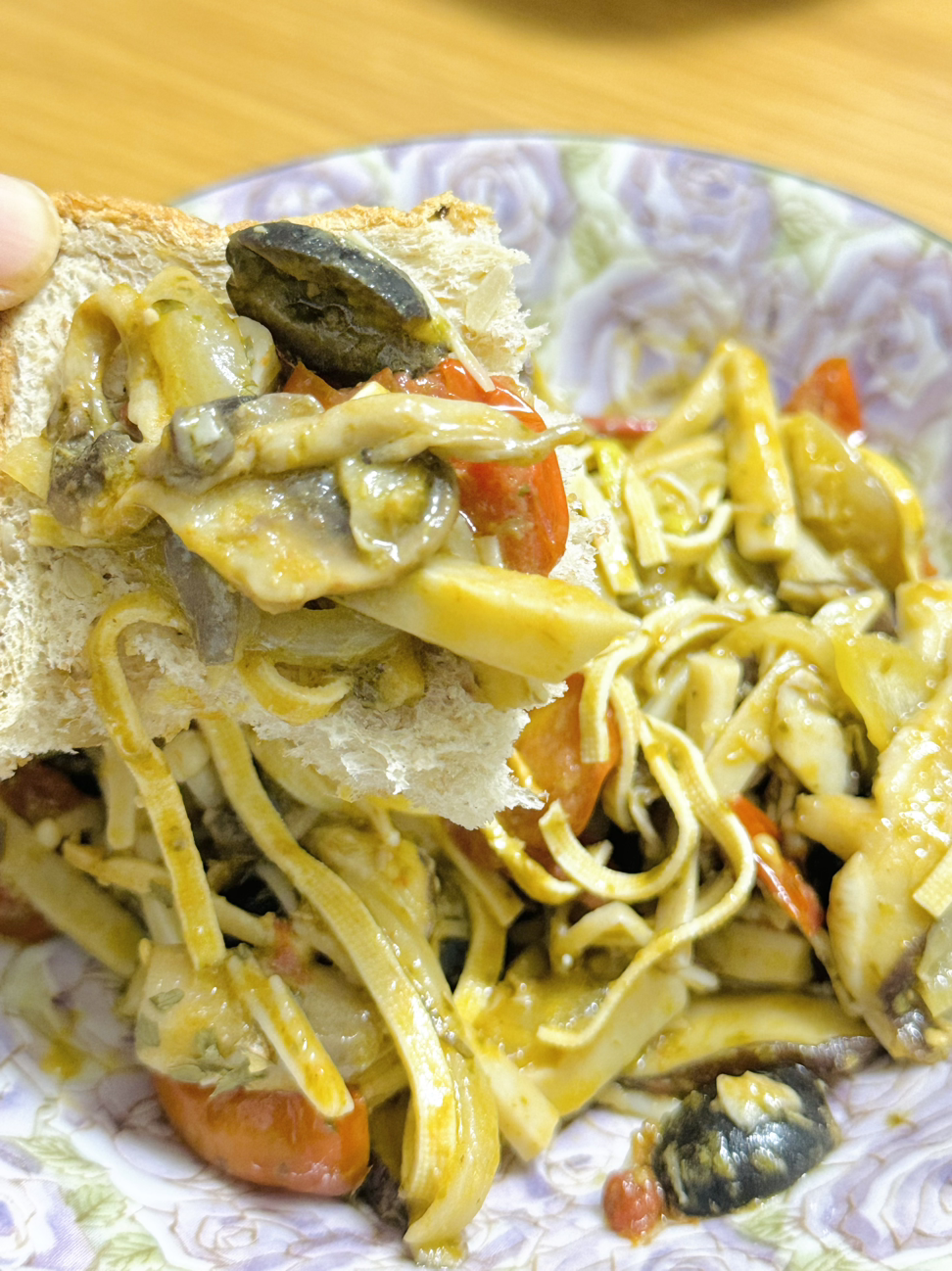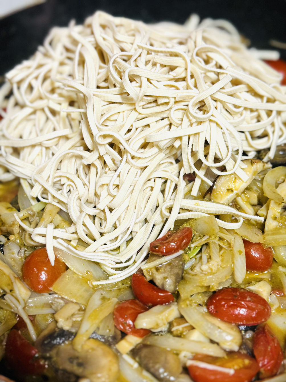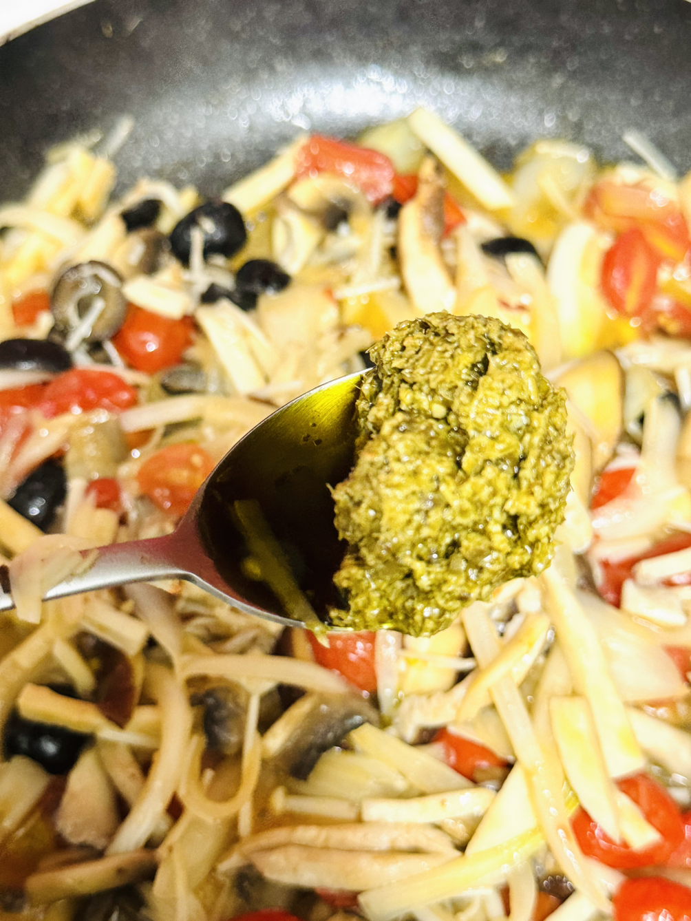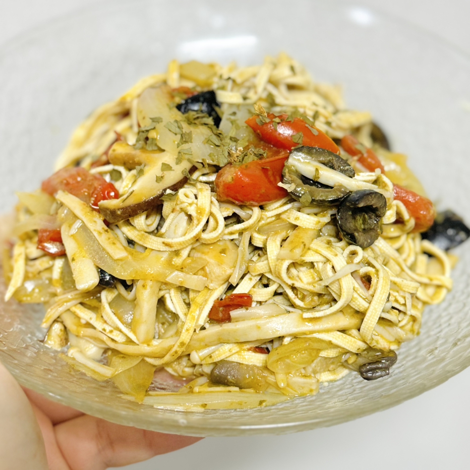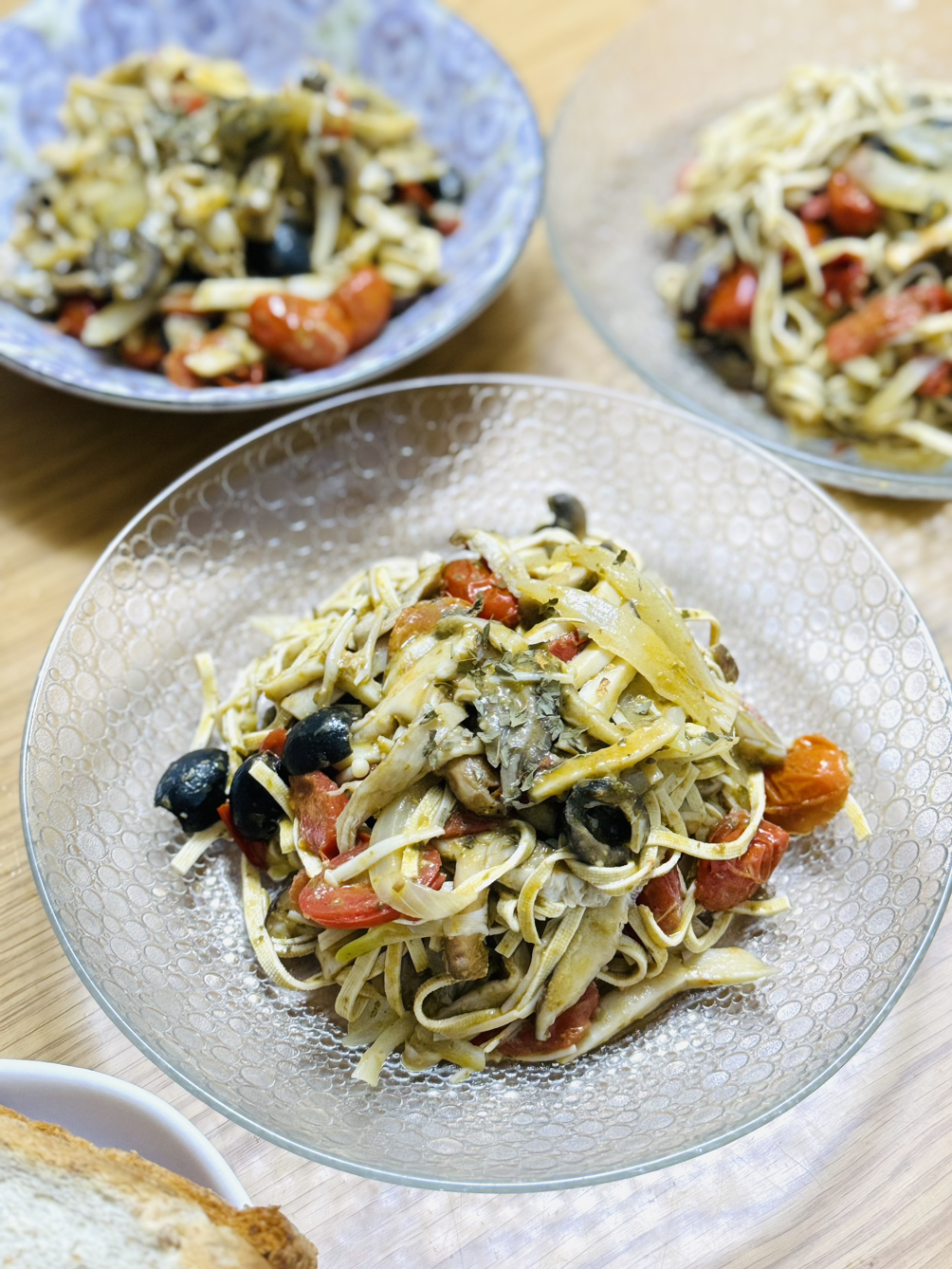 동물성 재료는 하나도 넣지 않고 완성한 바질페스토버섯파스타, 두부면이 어찌나 가벼운지, 속이 편하다는 느낌이 들었다.