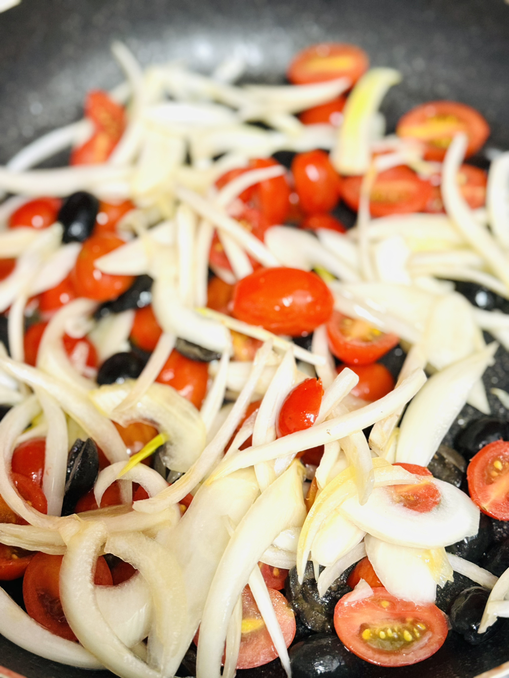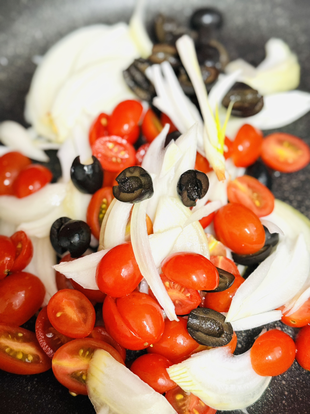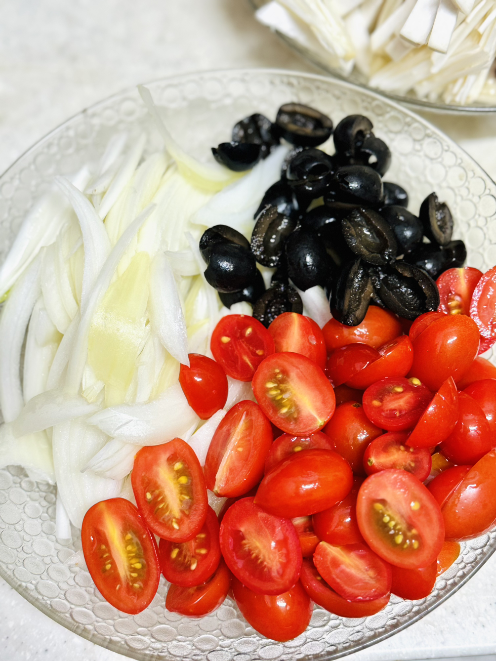 4. 방울토마토는 반으로 자르고, 양파는 채 썬다. 올리브도 통으로 넣으려다가 2 등분했다.