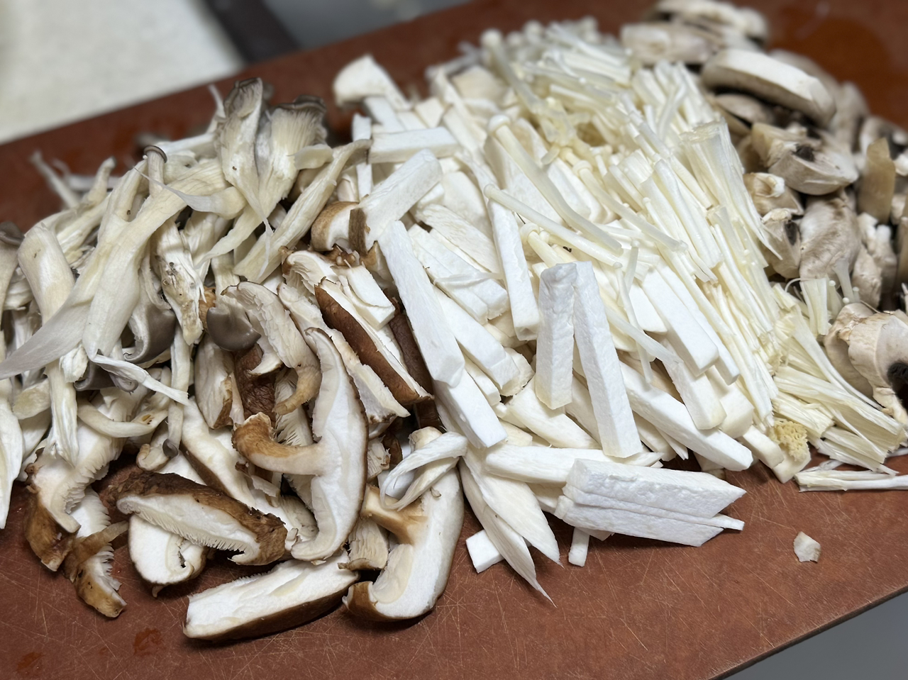 손질이 끝난 야채와 버섯들을 한 곳에 담아둔다.