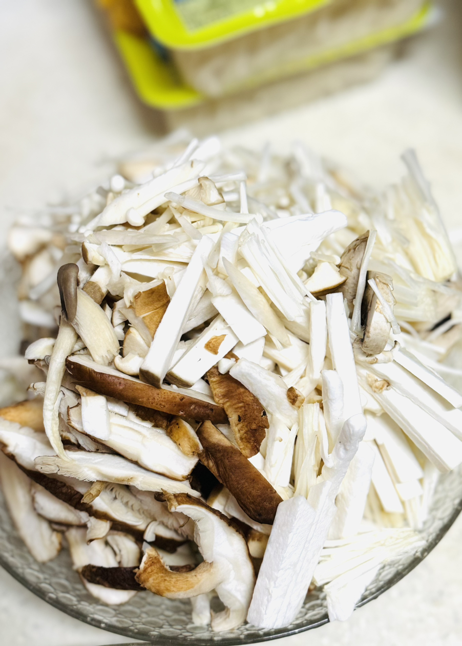 3. 각종 버섯들도 깨끗하게 씻은 뒤 먹기 좋은 크기로 자른다. 느타리버섯은 손으로 찢었다.