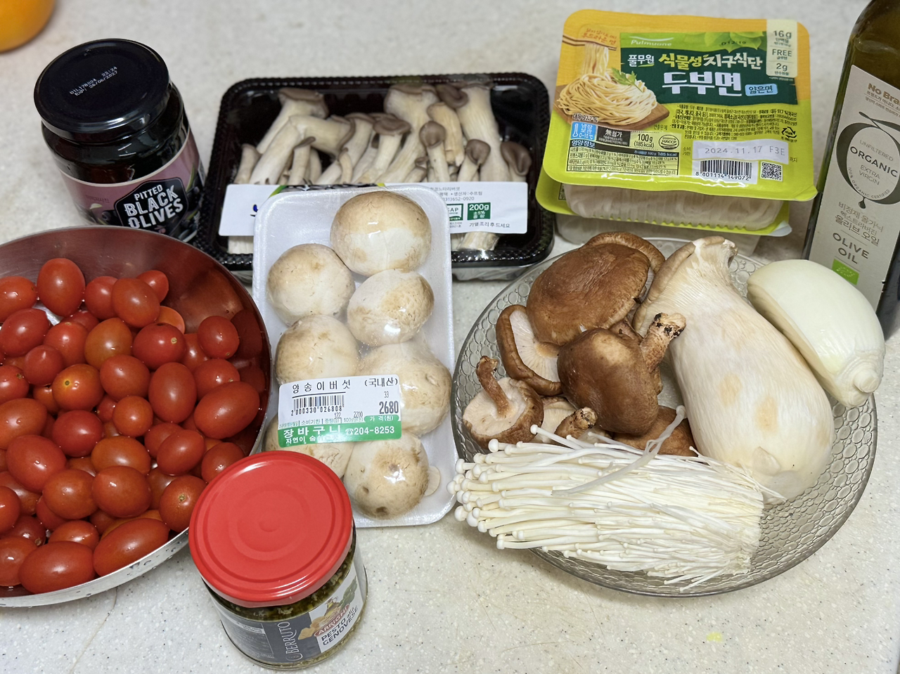 토마토, 양송이버섯, 느타리버섯, 팽이버섯, 표고버섯, 새송이버섯, 두부면, 올리브, 양파