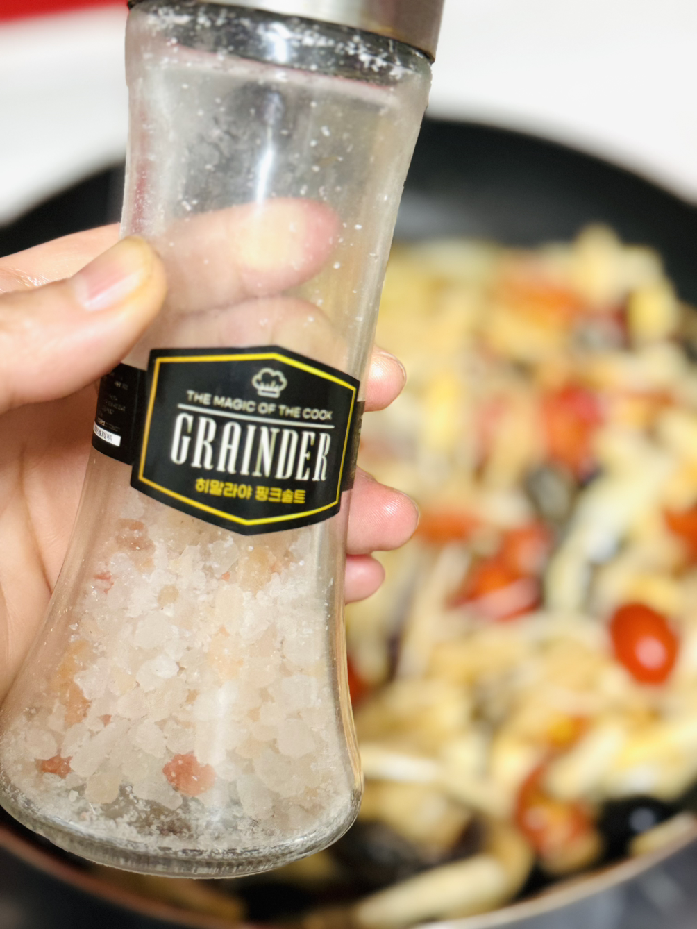 15. 먹을 접시에 담으면 끝. 위에 바질 가루도 솔솔 뿌렸다. 후추도 더 해주면 더 맛있을 것이다. (나는 깜빡 잊었음)