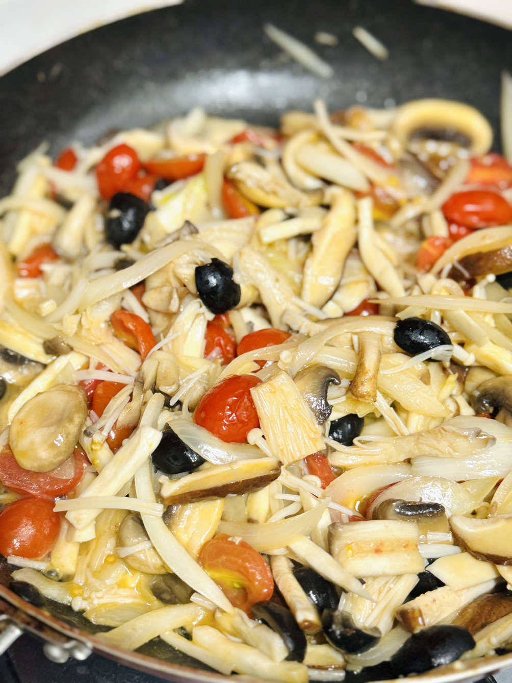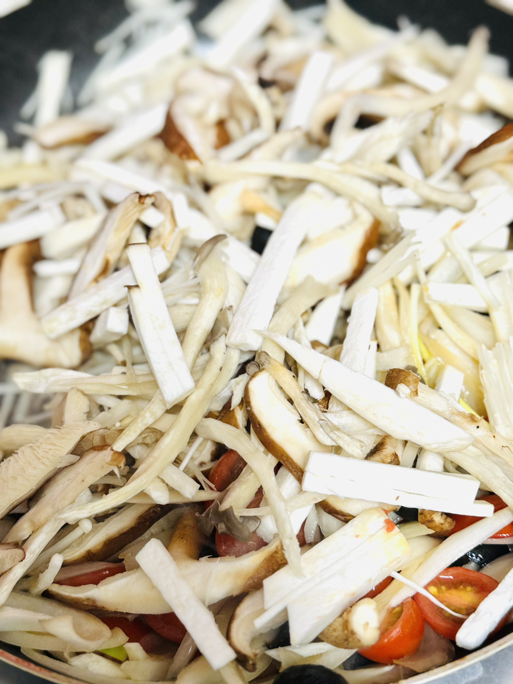 13. 볶아둔 버섯과 야채들 사이사이 잘 베일 수 있도록 섞듯이 볶아준다. 싱거우면 소금 톡톡 간을 맞추고,