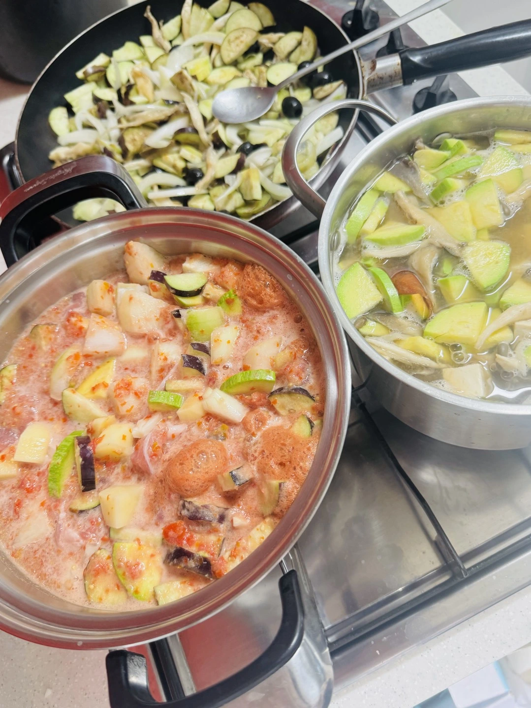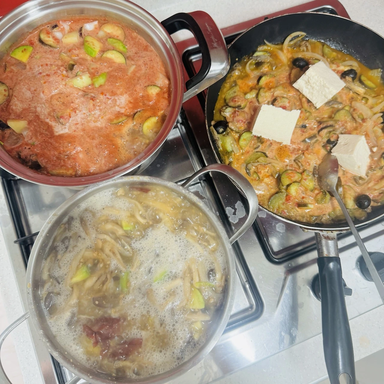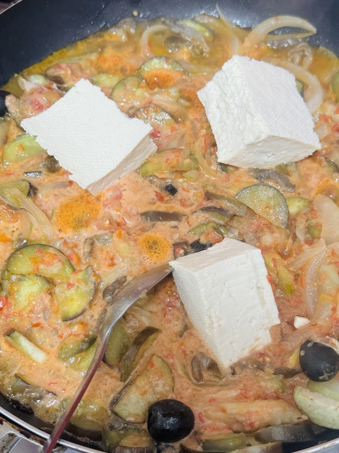 나만의 비건 개발 메뉴. 이름도 없다. 토마토 가지 수프라고 해야 할까? 역시 토마토를 왕창 갈아 넣고 올리브, 가지, 양파를 올리브유에 볶다가 두부 반모를 으깼다. 간은 소금으로 톡톡-
