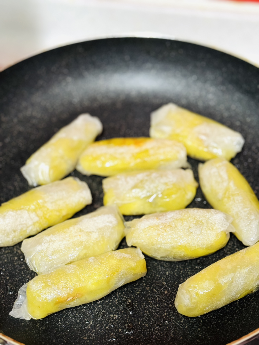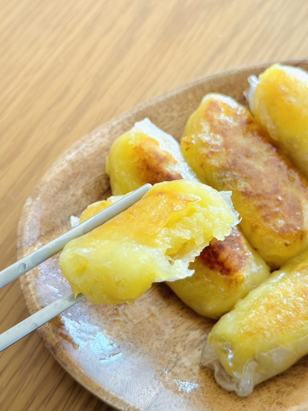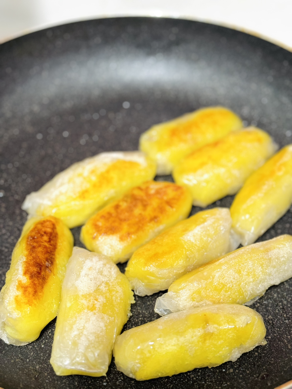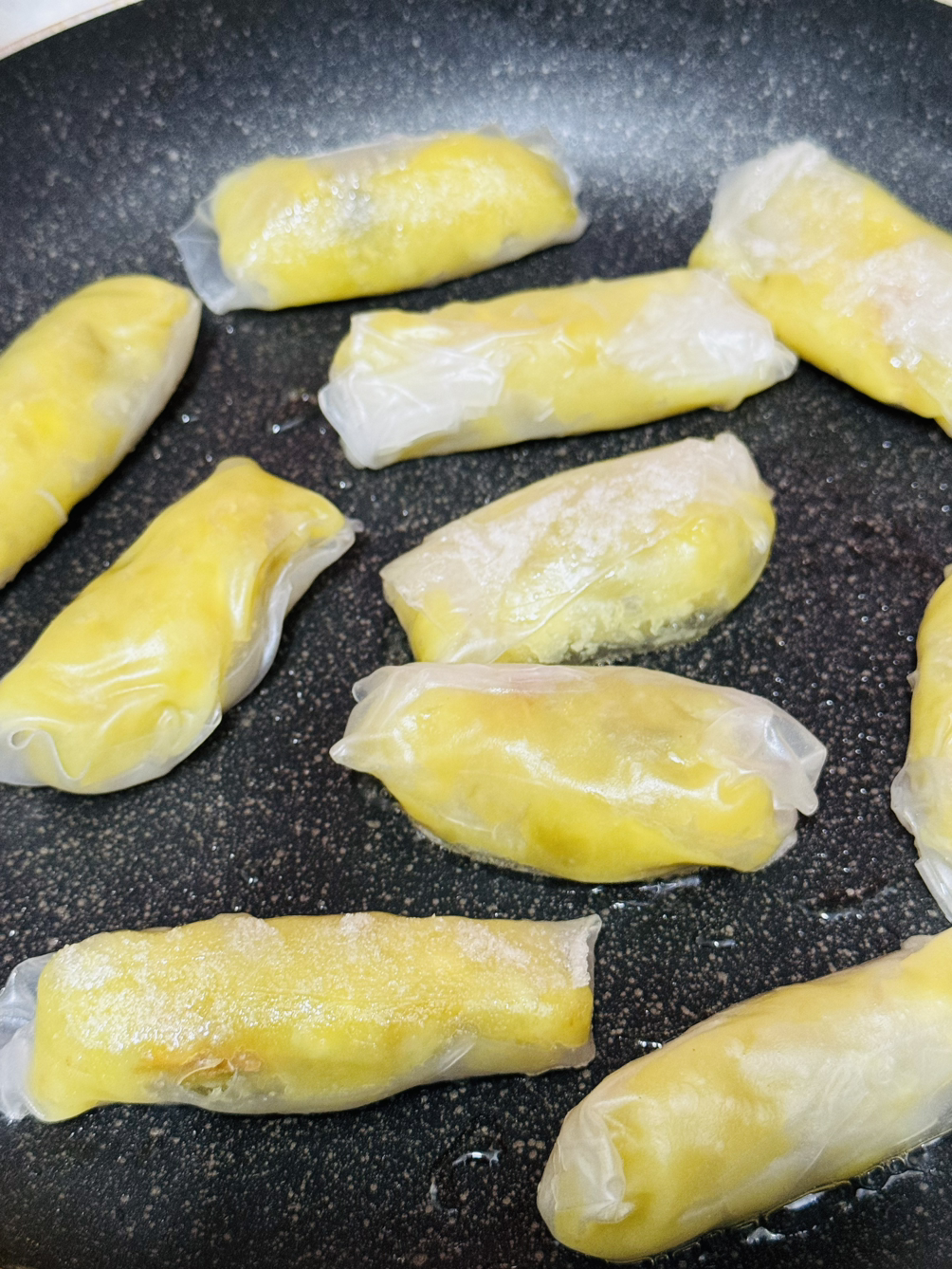 7. 프라이팬에 기름을 두르고 예열한 뒤 라이스페이퍼에 감싼 고구마를 구워주면 끝!