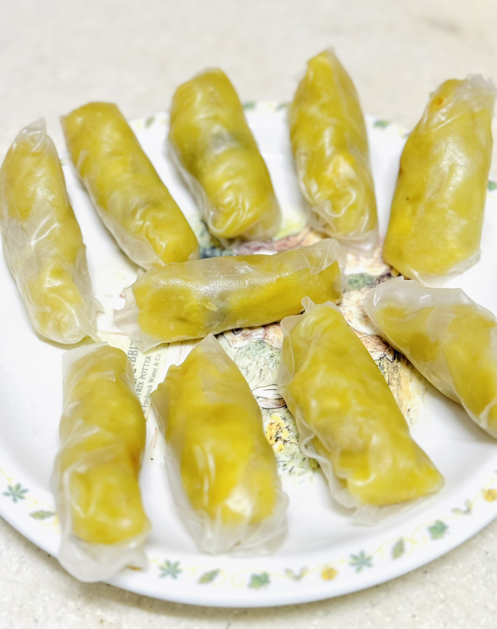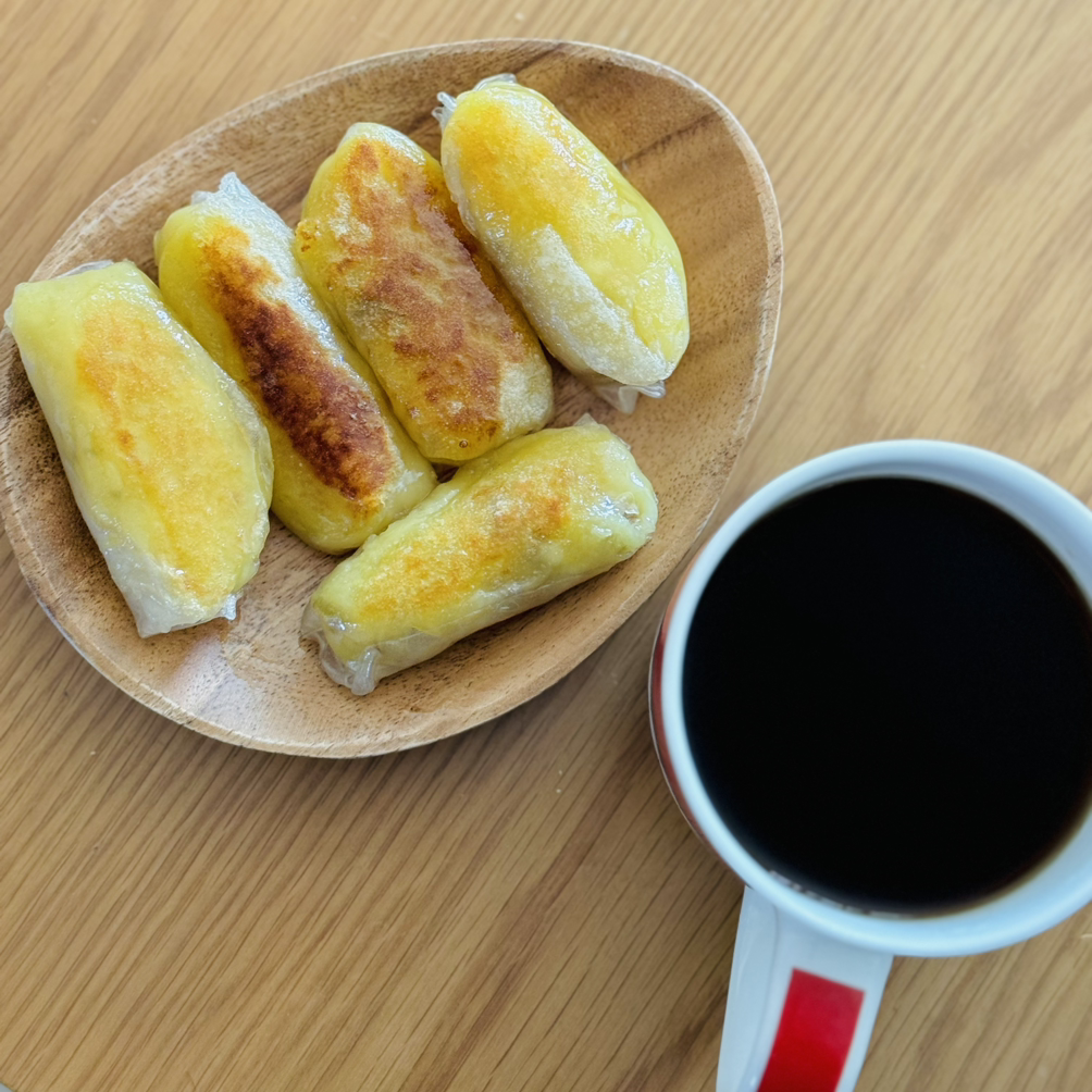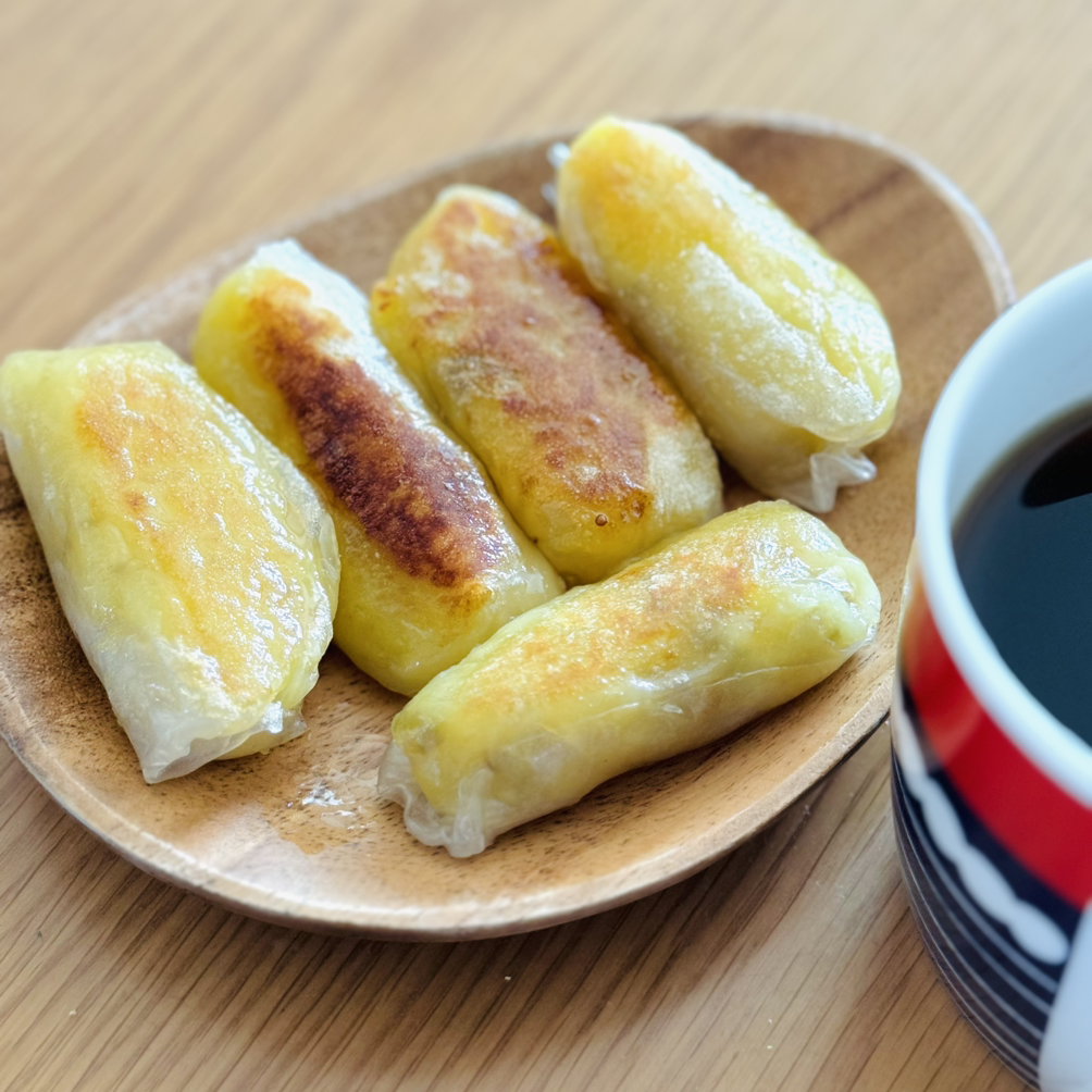 라이스페이퍼에 고구마 무스를 싸서 살짝 구워내어 먹는 간식. 겉의 라이스페이퍼 식감은 쫀득하고, 안 쪽 고구마는 달콤하고 부드러워서 지금 떠오르는 대로 이름을 붙여본다면 쫀득하고 달달한 쫀득이구마라고 해야겠다!