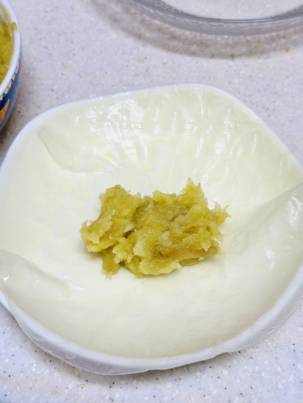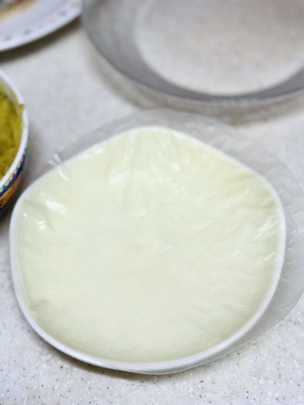 5. 접시에 라이스페이퍼를 놓고, 고구마 무스를 밥숟가락으로 크게 한 스푼 얹는다