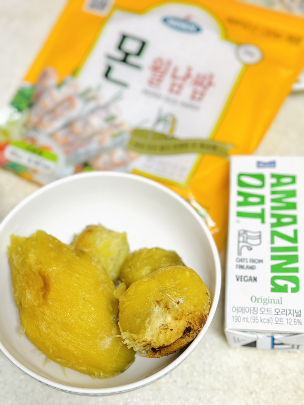 라이스페이퍼의 첫 식감은 구워서 바삭하지만, 씹을수록 쫀득하고 안에 고구마는 달콤하고 부드럽다. 두유로 반죽처럼 해서 촉촉하기도 한 매력만점 쫀득이구마!이구마! 쫀득 달달한 고구마 간식