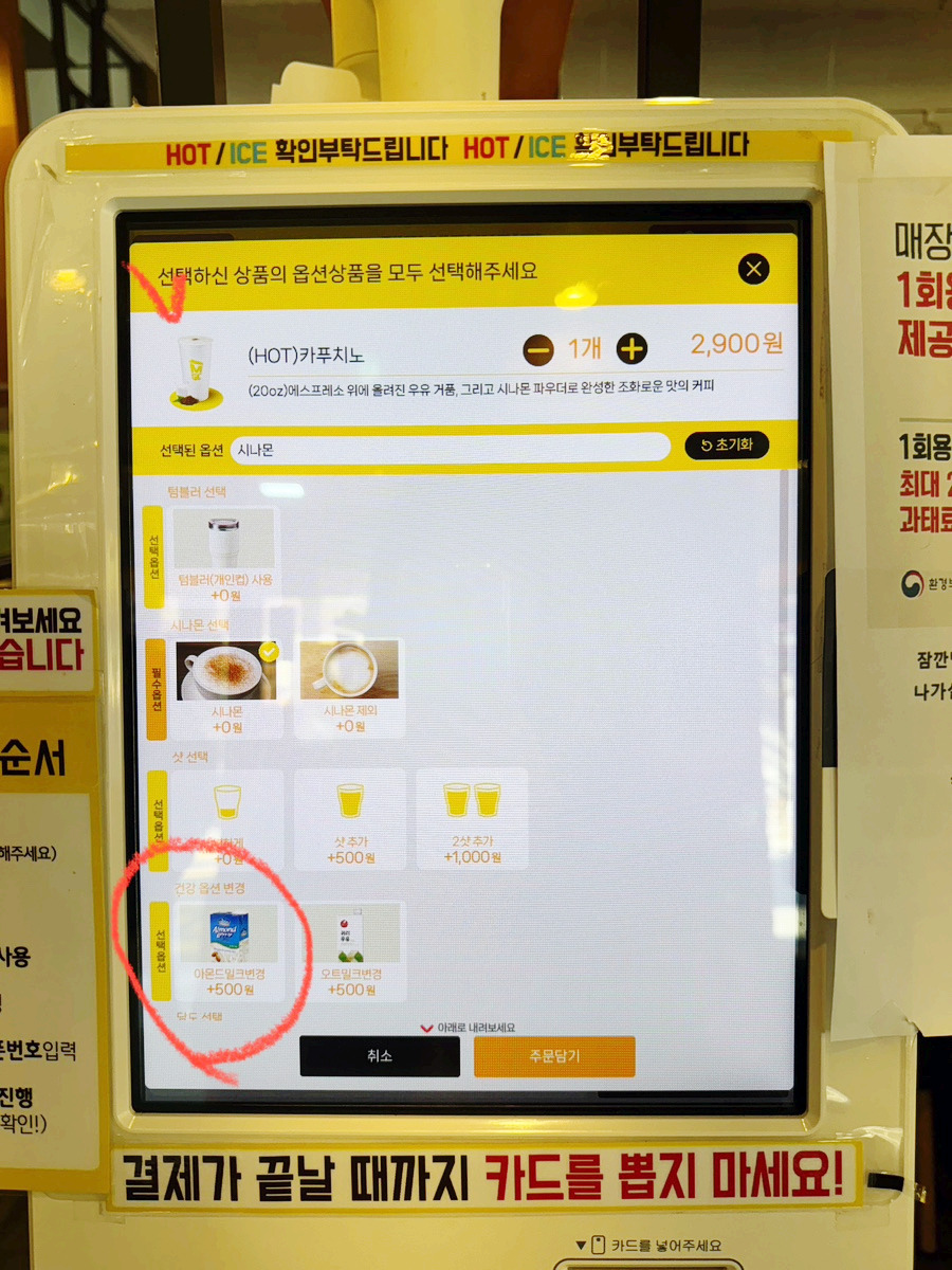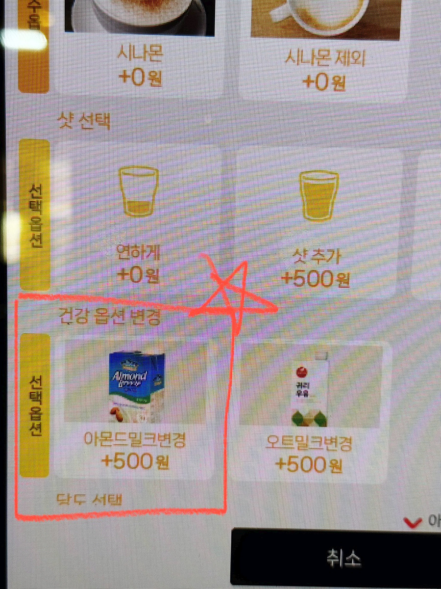 여기에서 아몬드밀크로 변경하면 500원을 추가해서 식물성 음료로 변경할 수 있어요!