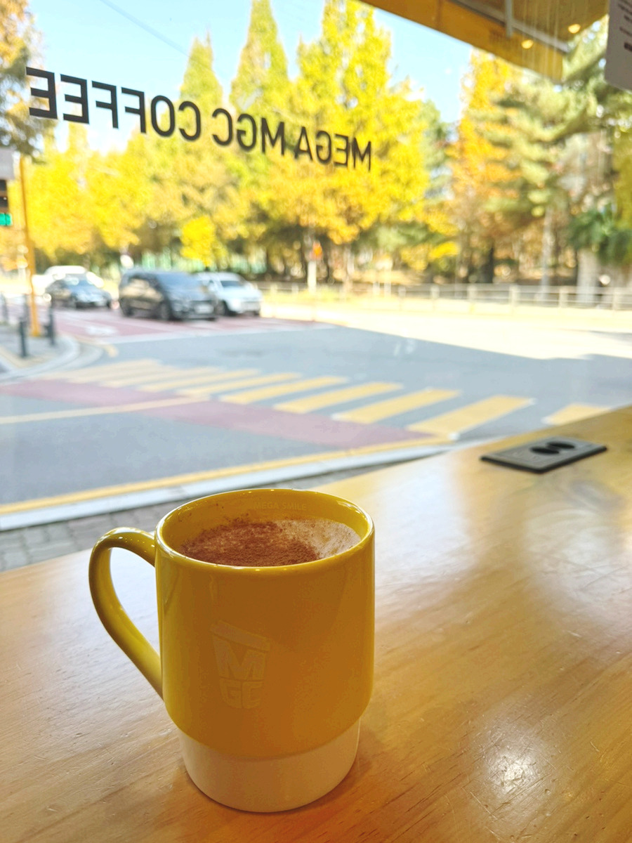 오전 디지털드로잉 수업을 마치고 동네로 이동해서 방앗간처럼 들리는 메가커피에 왔어요. 솔직히 스터디 카페가 더 집중이 잘 되지만, 메가 커피는 통창으로 개방감이 있고, 창밖 풍경으로 완연한 그 계절과 날씨를 느낄 수 있어서 힐링하고 싶을 때 오곤 해요.