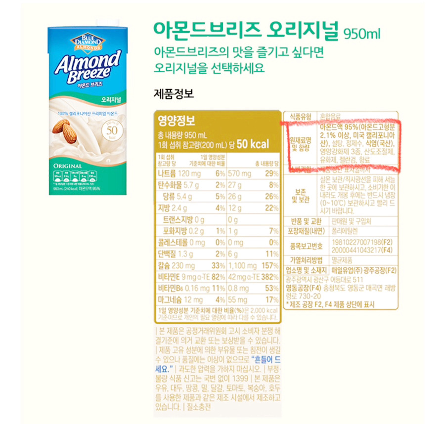 매일유업 아몬드 브리즈 오리지널 우유 밀크 음료 두유의 성분을 보시면, 우유는 들어가 있지 않답니다.