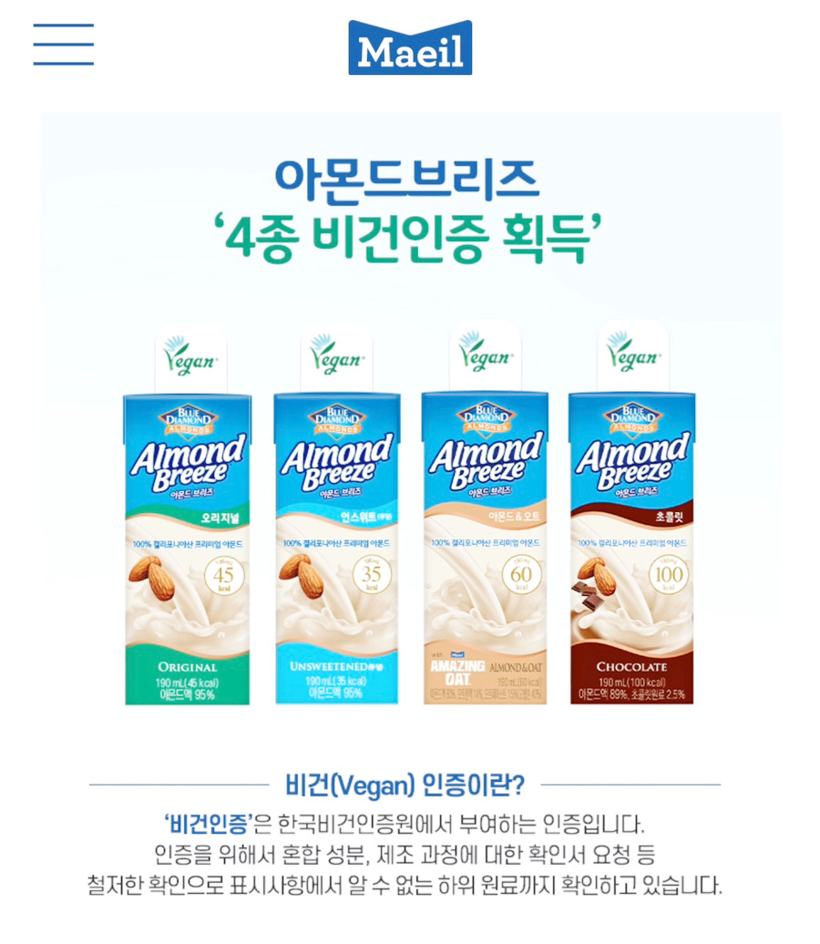 매일유업 아몬드 브리즈 라인은 비건 인증도 받았다고 하네요!