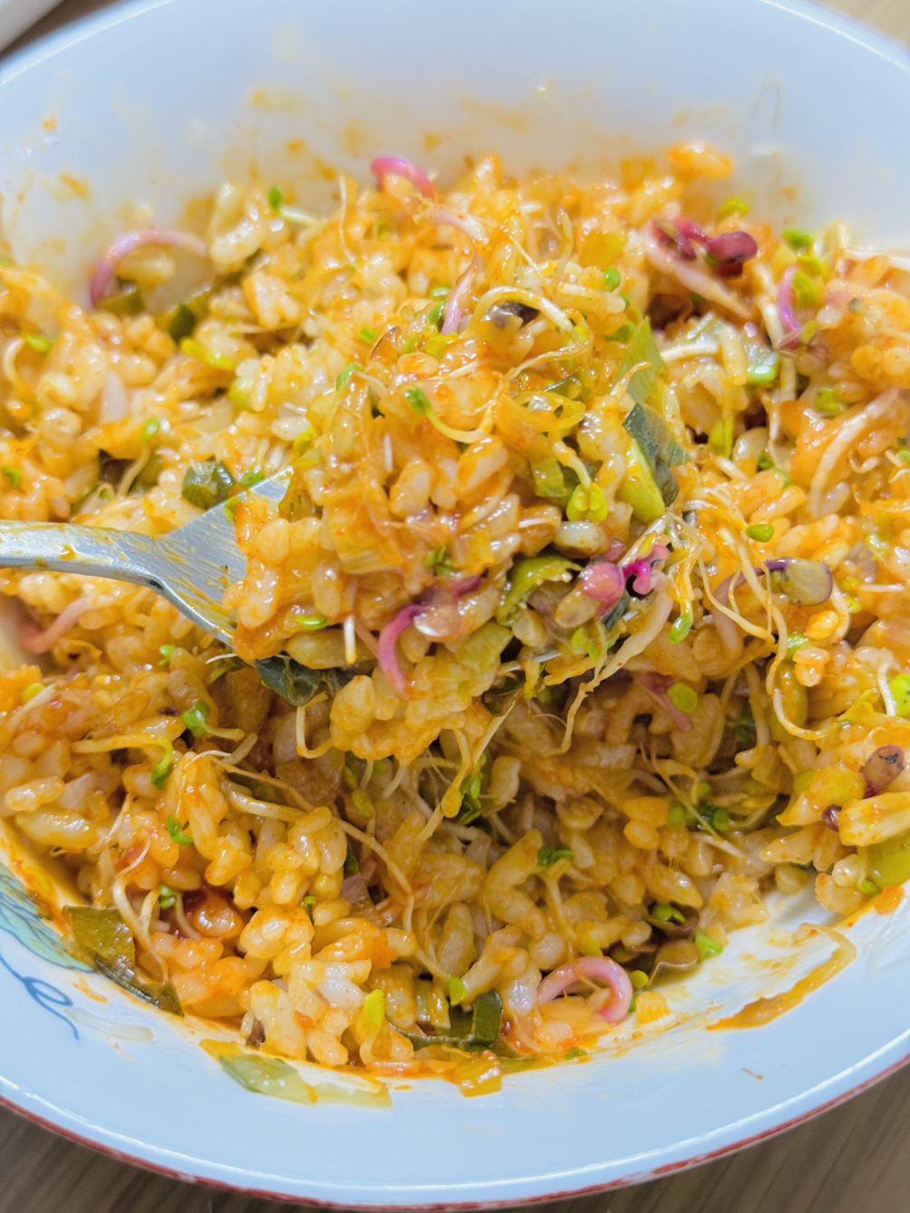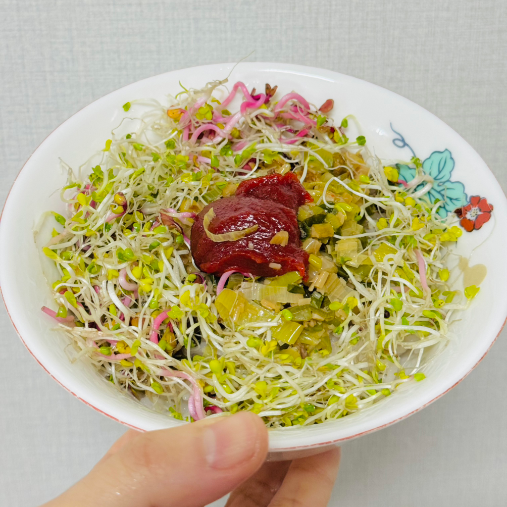10. 역시 뜨거운 밥 위에 '팽이버섯 대파 볶음'을 얹고 주변에는 새싹 야채를, 가운데에는 고추장을 얹으면 완성!