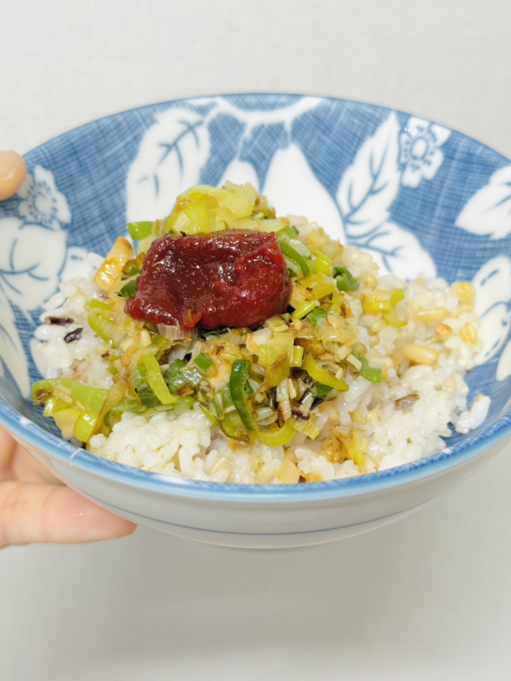 6. 갓 지은 밥 위에 볶은 팽이버섯과 대파, 고추장을 얹는다.