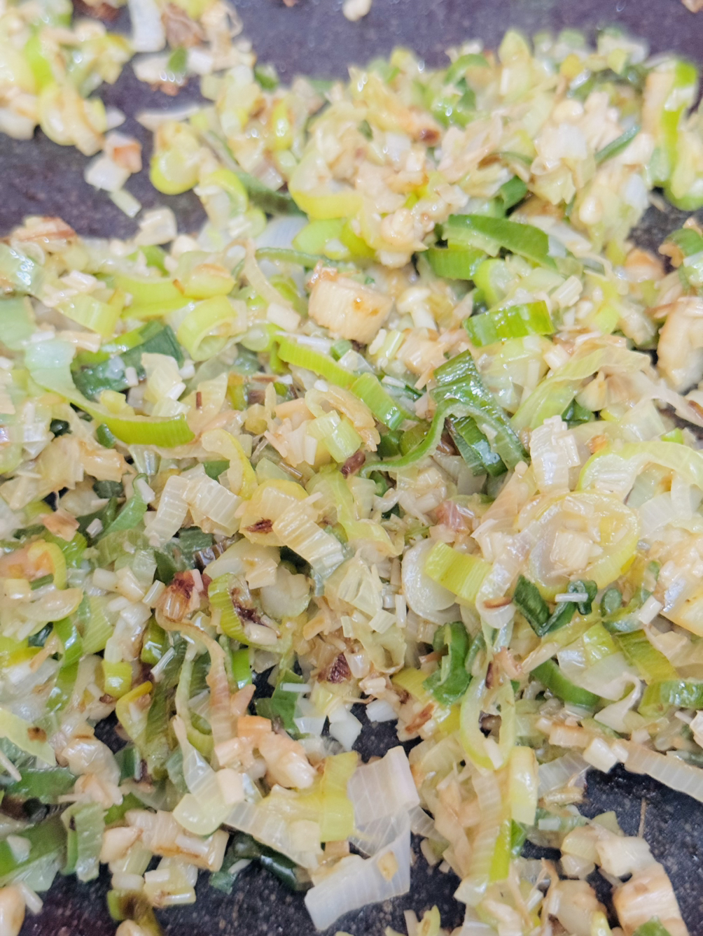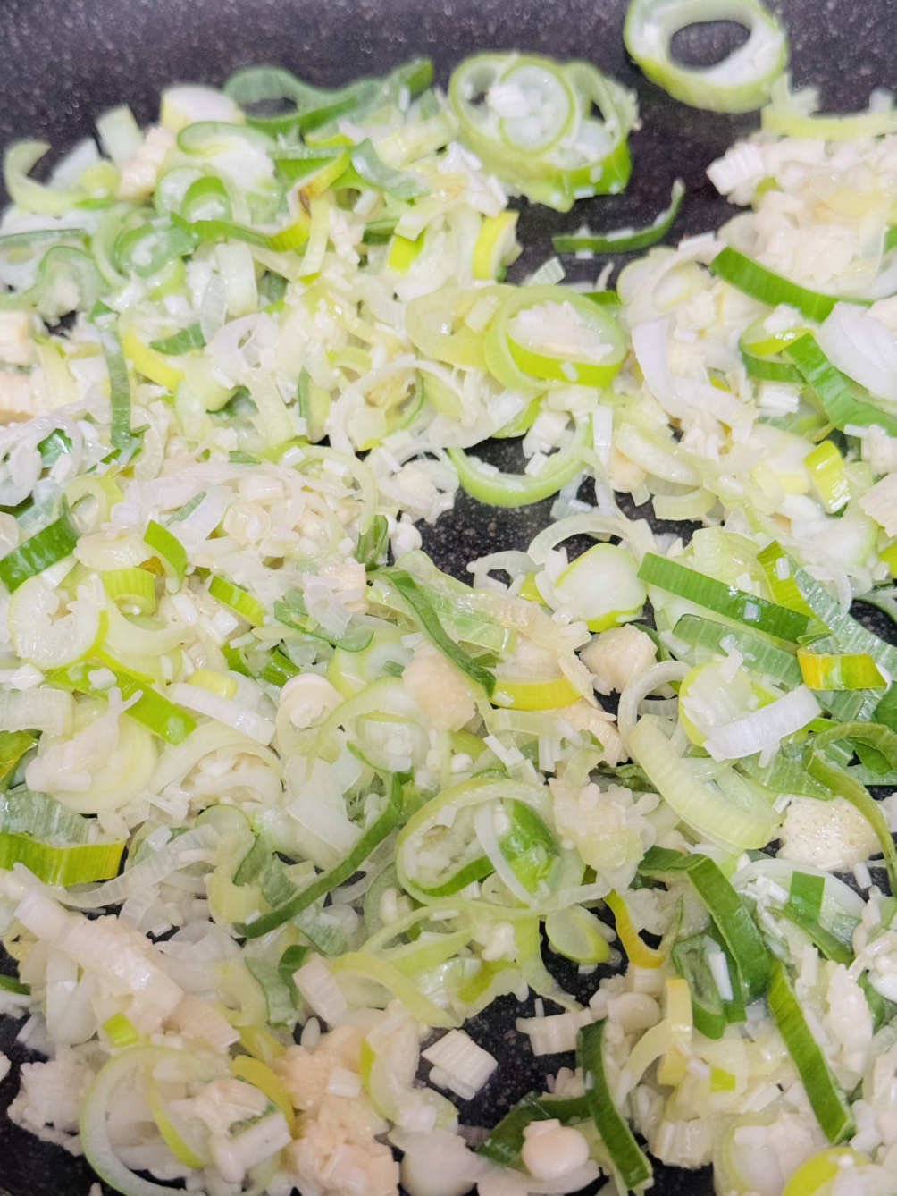3. 쫑쫑 썬 대파와 팽이버섯을 프라이팬에 투하해서 볶는다