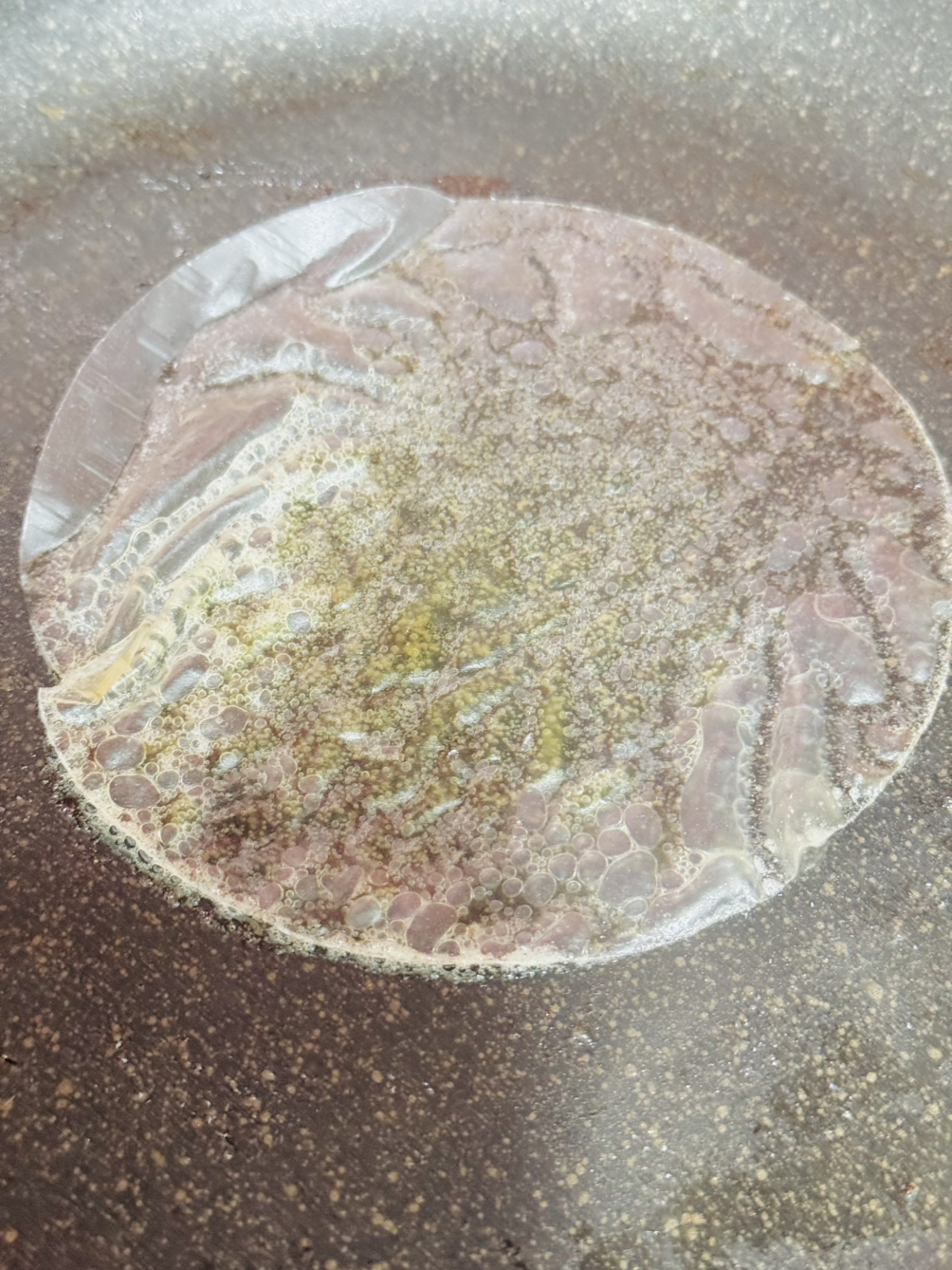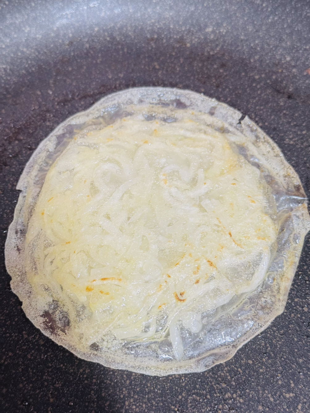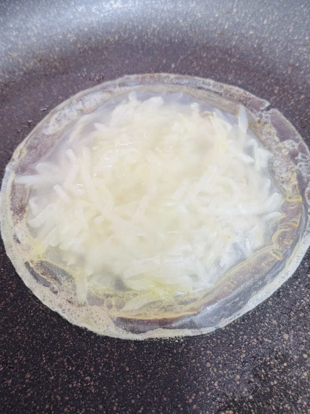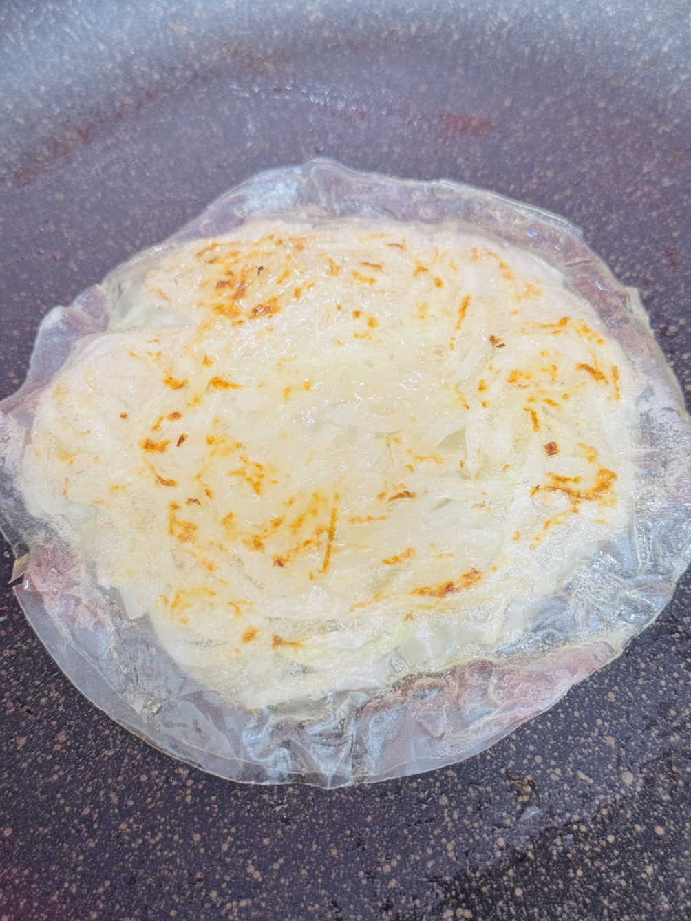 4. 무를 익힐 동안 끓인 물에 라이스페이퍼를 살짝 적셔서 들기름 두른 프라이팬에 살짝 얹는다.