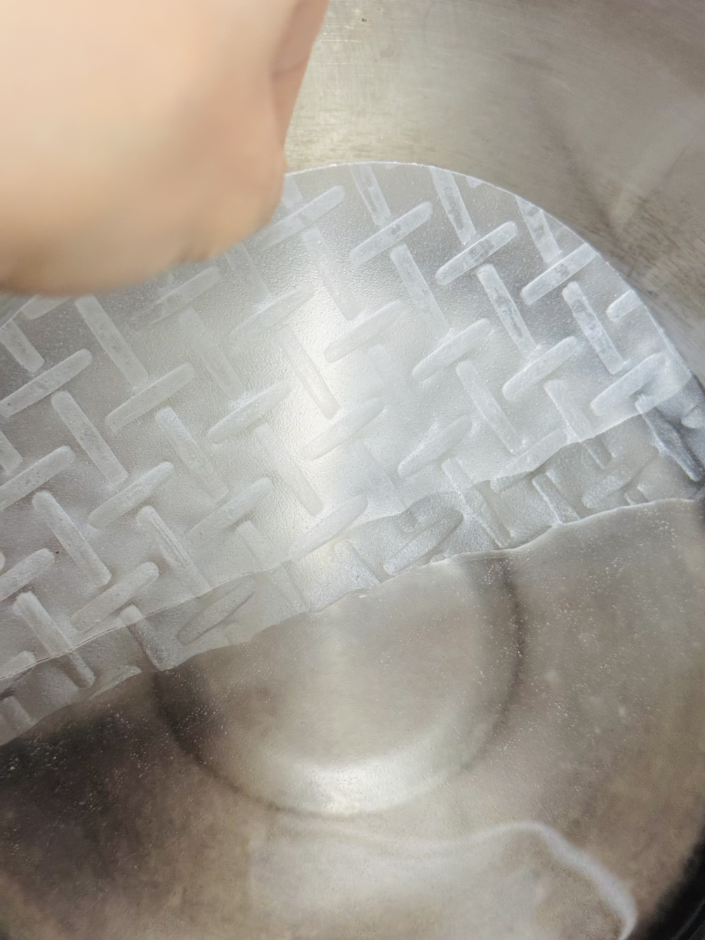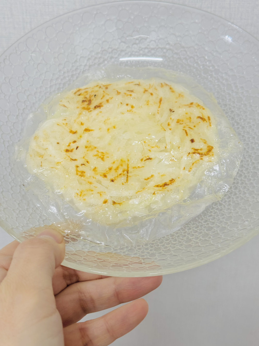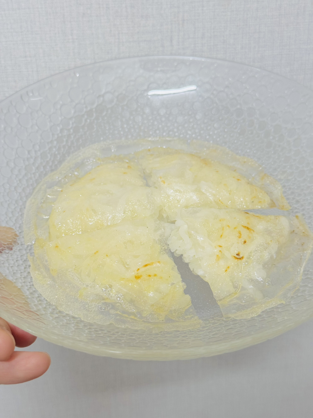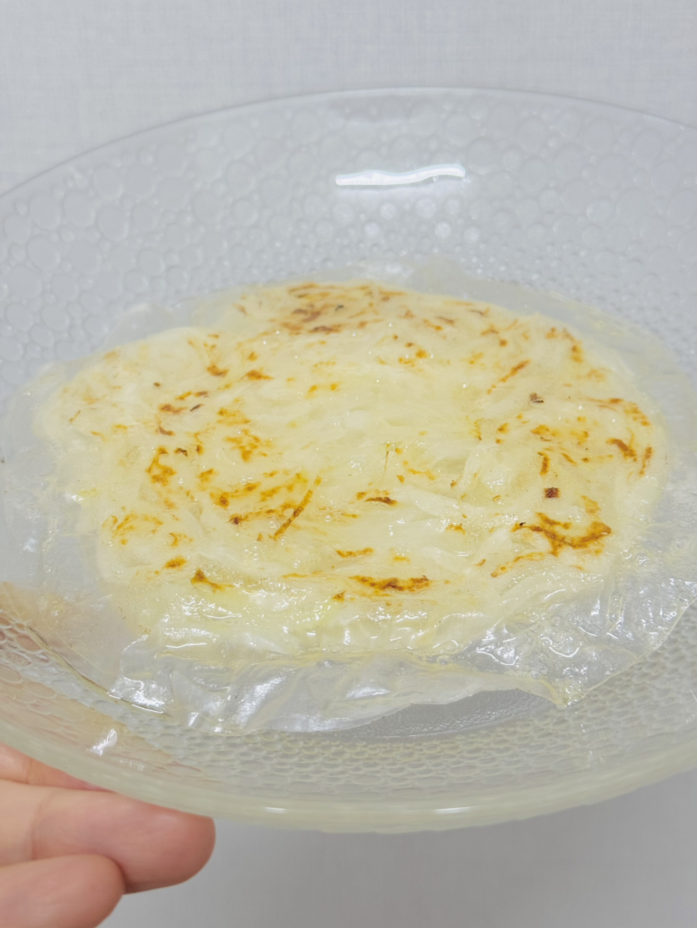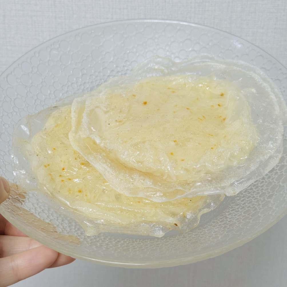 4. 무를 익힐 동안 끓인 물에 라이스페이퍼를 살짝 적셔서 들기름 두른 프라이팬에 살짝 얹는다.