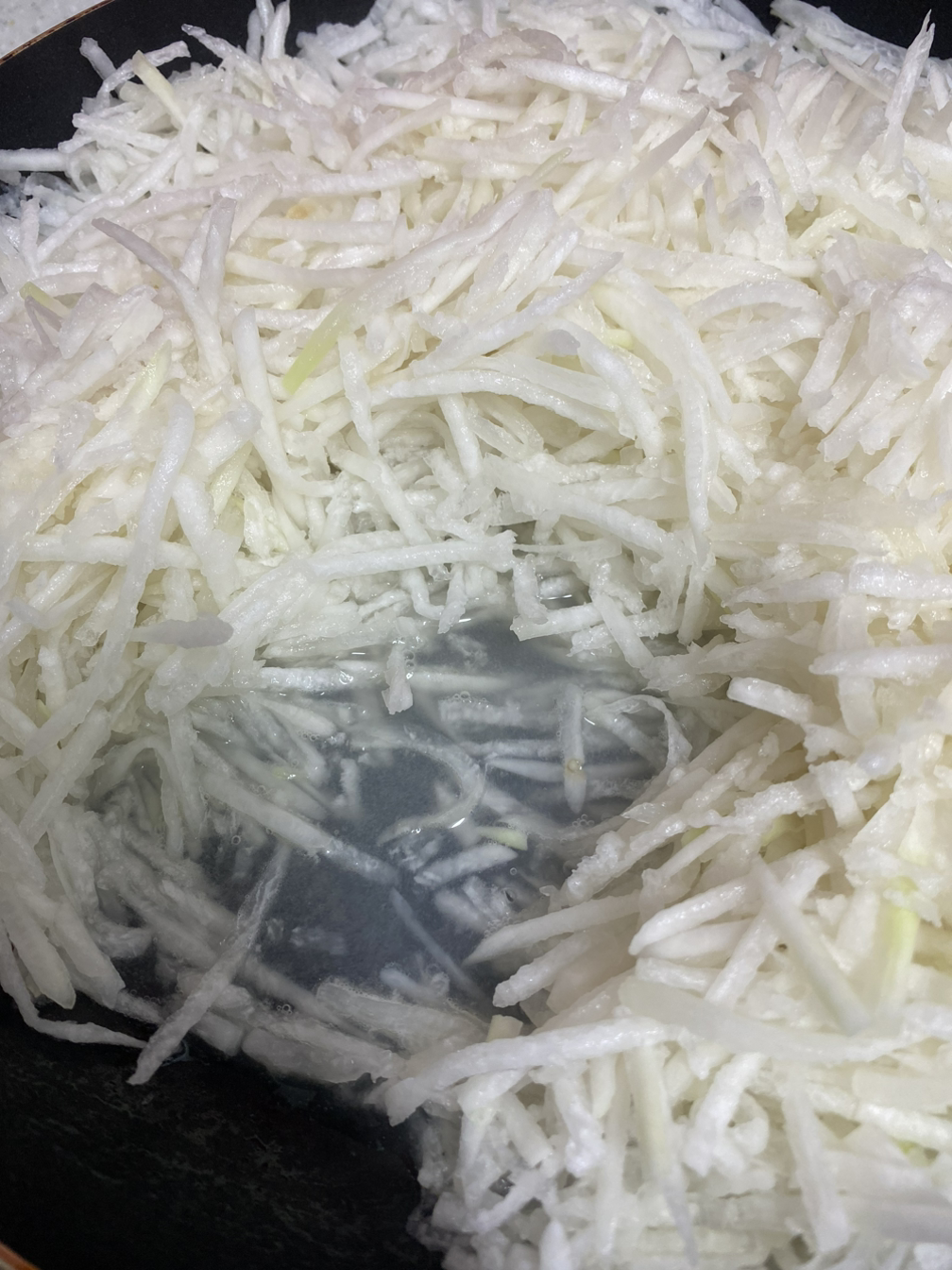 2. 프라이팬을 달구고 들기름을 두르고 무를 넣고 익힌다. 조금 더 부드러운 식감을 원한다면 물을 살짝 자박하게 하고 소금으로 살짝 간한다.