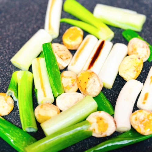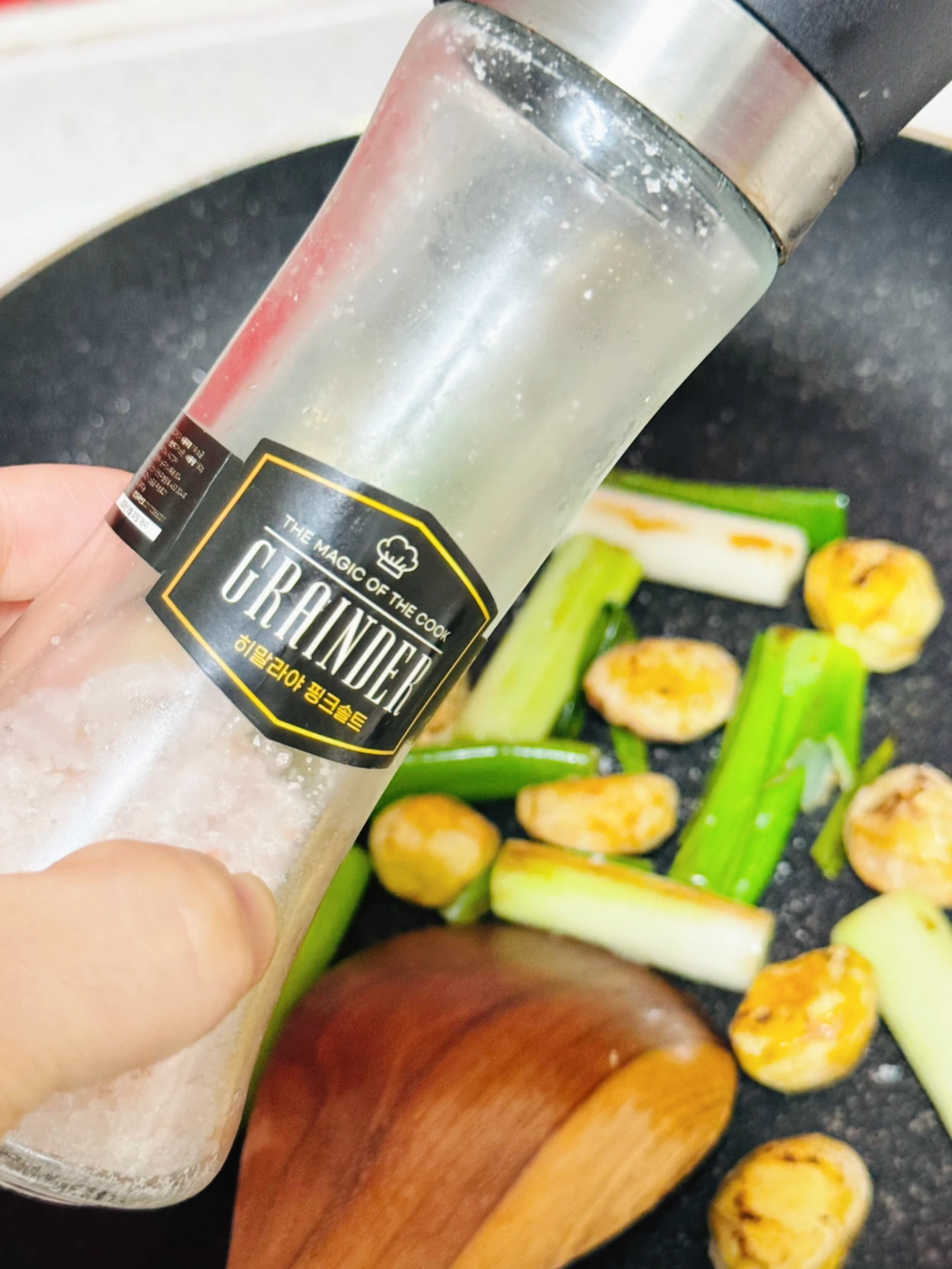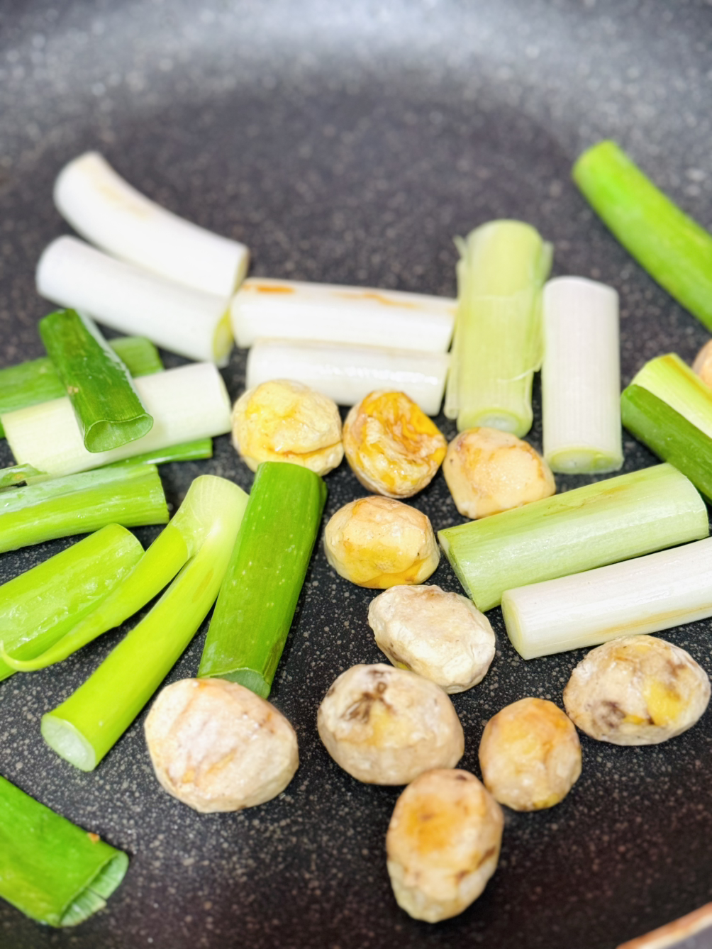 3. 뒤집어 가며 밤과 대파가 노릇노릇하게 굽는다.