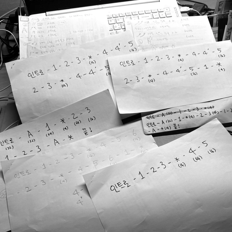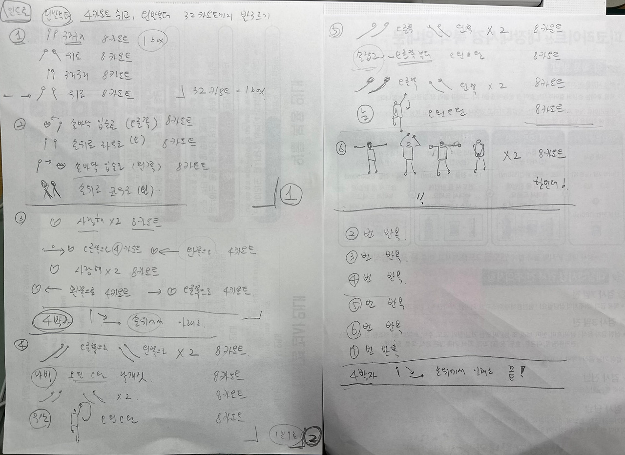 순서지는 곡의 동작 순서를 정리한 종이인데, 사실 나는 순서지를 처음 본 까막눈이었다. 이번에 직접 만들어보니 안무 숙지에 얼마나 도움이 되는지 실감했다.