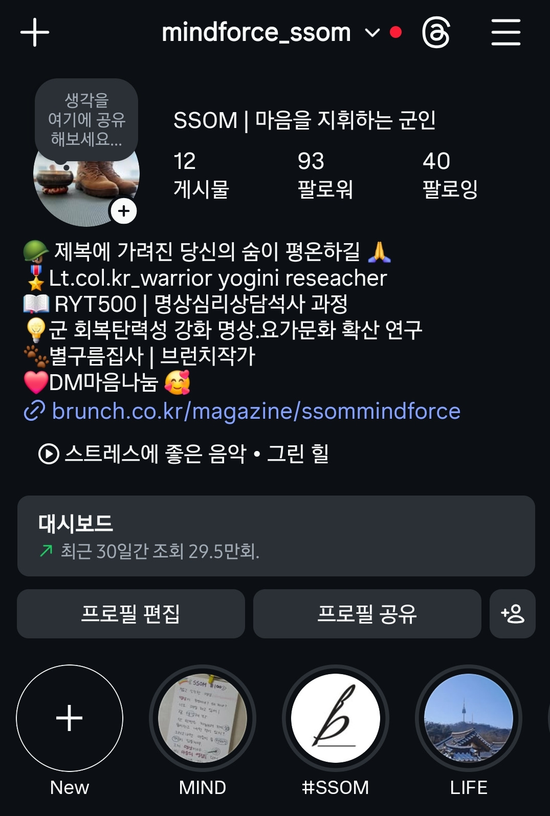나름 인스타 탐색전 후 브런치와 연결고리를 만들고 명상요가 특성을 담은 계정을 개설했다.