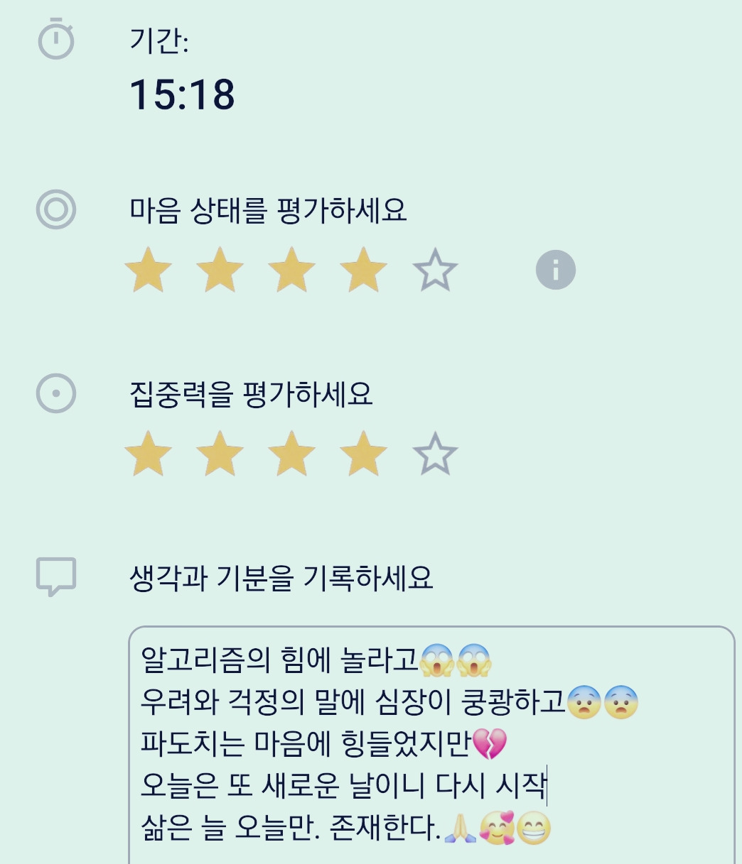 자기 확언을 쏟아부었지만 마음이 요동치는 소리가 들렸다. 긴장된 마음이 풀어지지 않았고, 심장은 계속 빠르게 뛰고 있었다. 밤잠을 설쳤고 거의 뜬눈으로 밤을 지새웠다. 아침에 눈을 뜨자마자 명상앱을 켰다. 조용히 호흡에 집중하기 시작했다. 그리고 새로운 날이 시작되었다는 것에 집중했다.
