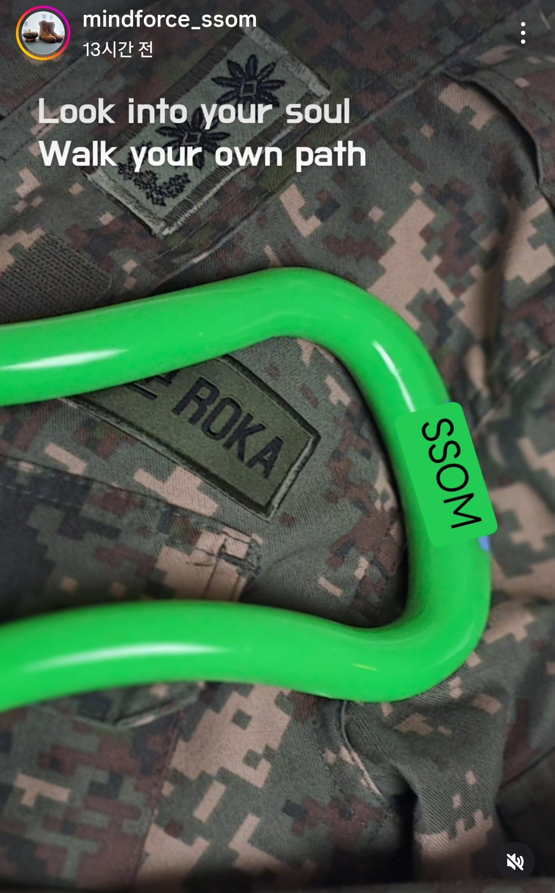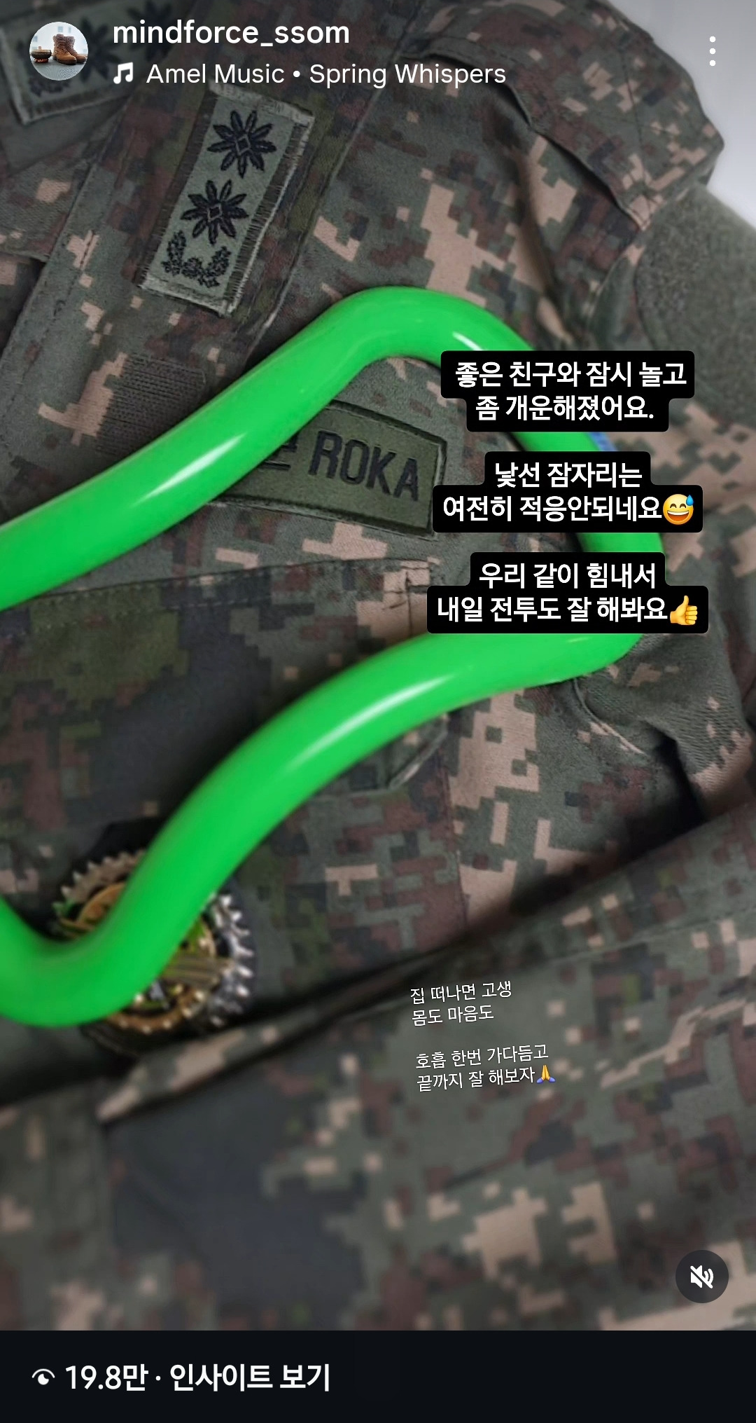 온몸을 요가링에 기대어 마사지하고 나서 전투복을 침대 위에 올려두고 사진을 한 장 찍어서 우리 모두 힘내요 이런 7초짜리 릴스를 올렸는데 점점 시간이 지나면서 이 짧은 기록물이 19만 인사이트를 기록하는 일이 발생했다.