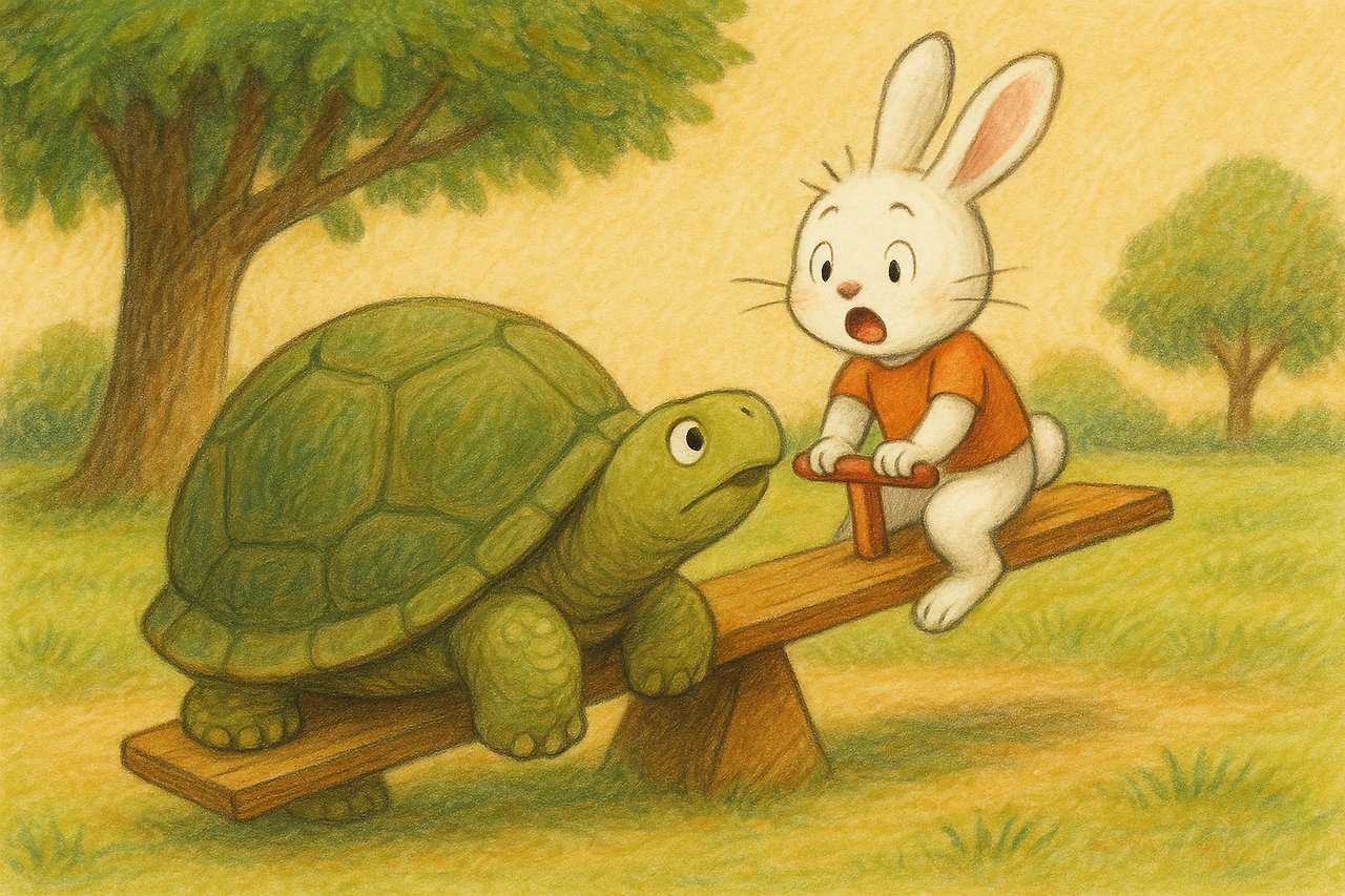 시소는 거북이 쪽으로 ‘쿵’ 하고 내려갔고,