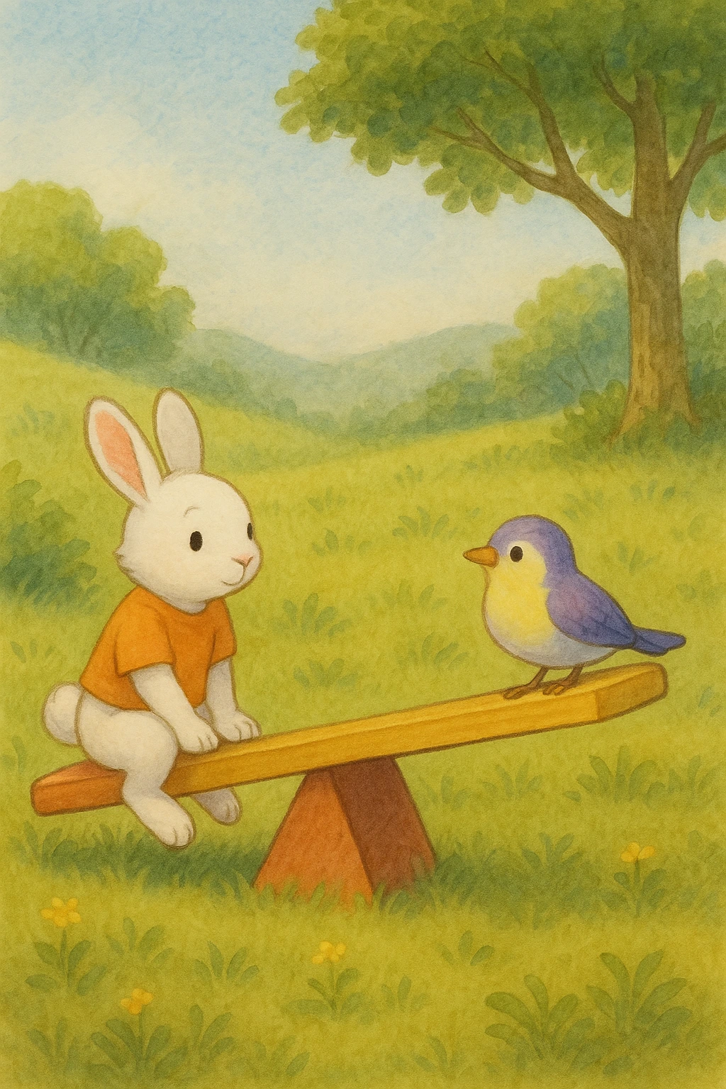 작은 토끼가 시소 한쪽에 앉아 있었어요.