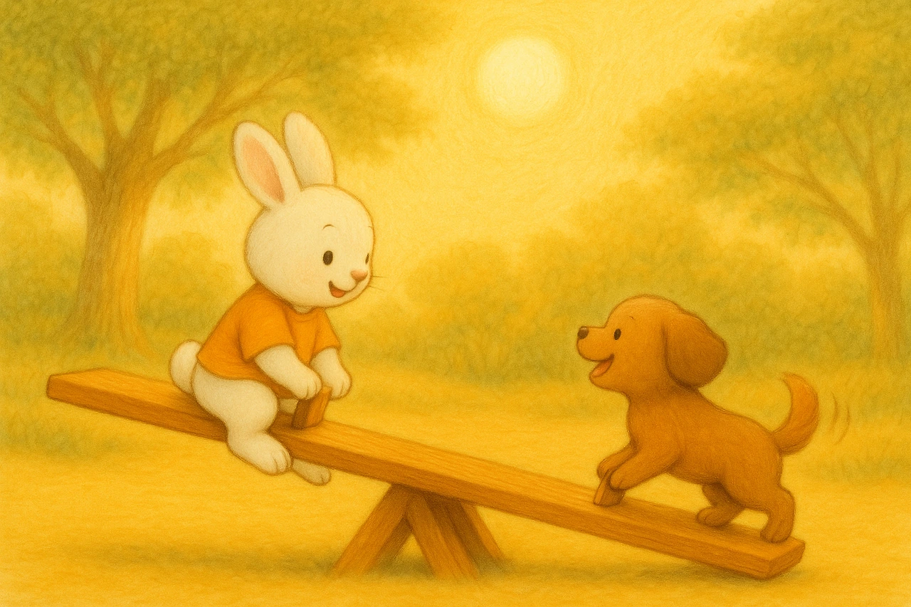 토끼는 부드럽게 발을 밀며 시소를 살짝 움직였어요.