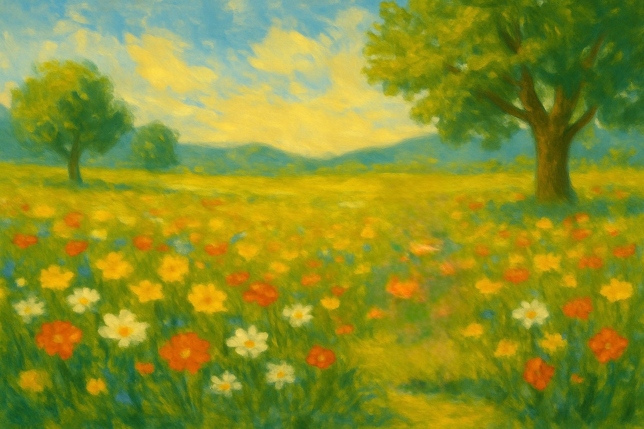 노란 꽃, 분홍 꽃, 하늘빛 꽃들이 바람에 살랑거렸죠.
