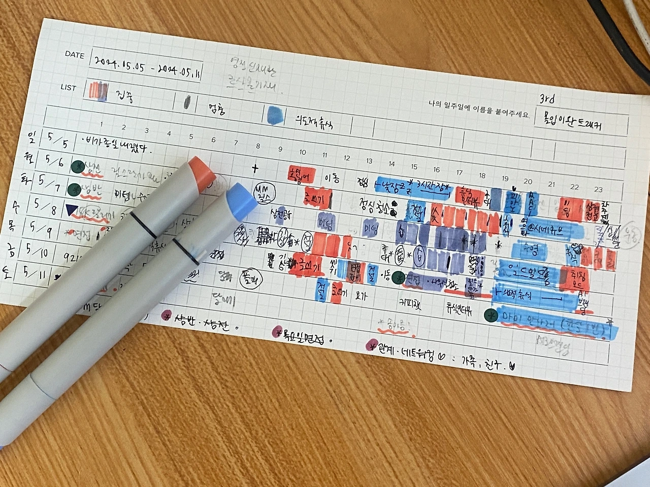 처음에는 약간 강박도 있어서 모든 칸을 이 색 저 색으로 채우려고 신경 썼지만, 적당한 열기로 계속 나를 돌봐주려면 과감하게 단순화할 필요가 있다고 느꼈기에. 지금은 몰입과 멈춤, 의도적 휴식 시간 만을 기록하고 있습니다. 이렇게 하루하루 시간을 색칠하고부터는 매일매일이 조금 더 선명하고 충만해지는 기분이 듭니다. 또 과거나 미래가 아니라, 현재에 조금 더 집중하게 도와주는 도구로서도 정말 만족스럽고요.