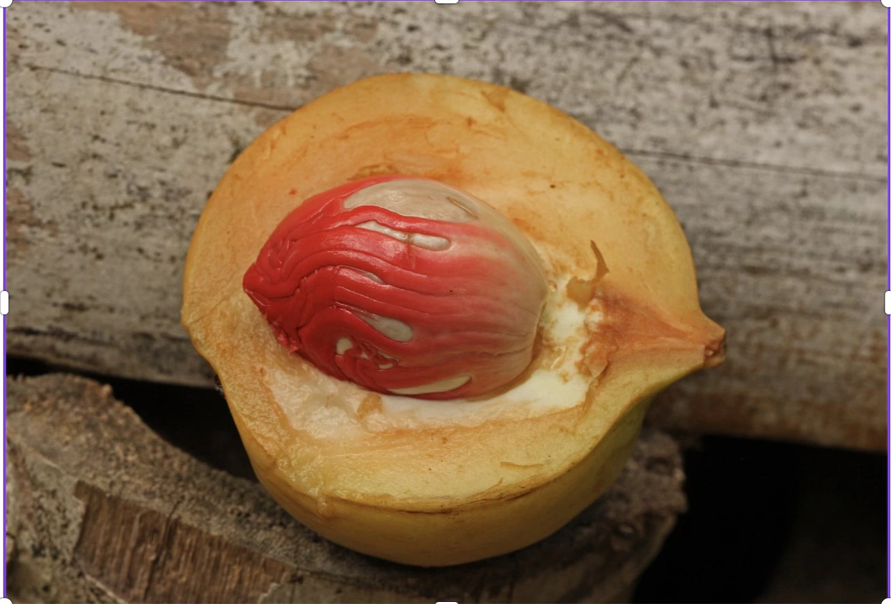 그 안에 우리가 사용하는 씨앗, 넛맥(nutmeg)이 들어있다. 씨앗을 감싼 붉은 망사 같은 껍질이 있는데 그것은 메이스(mace) 라고 부르는 또 다른 향신료다.