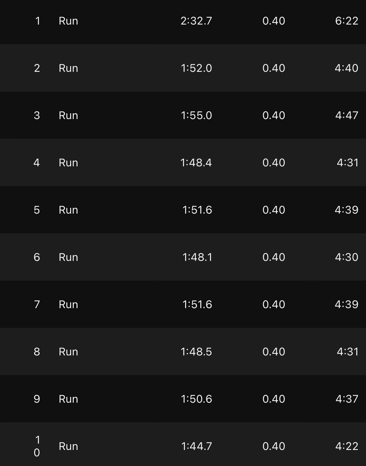 인터벌 페이스는 4:30-4:40 사이로 뛸 때 적당히 힘들면서 10개를 채울만큼의 속도인것 같다.