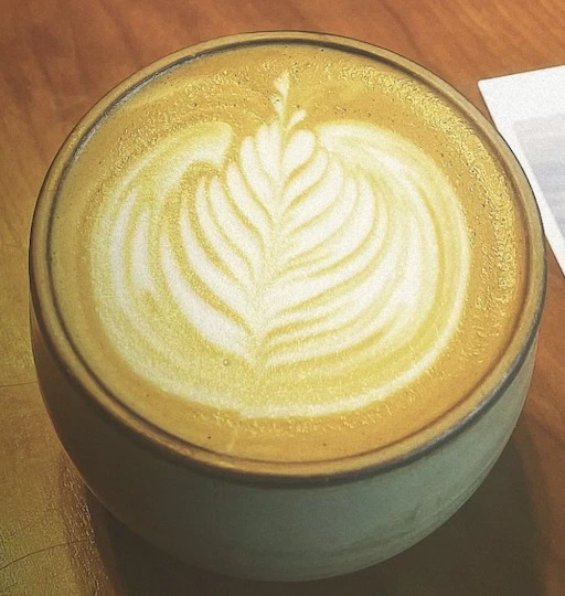 3. 잔을 기울여 스팀한 밀크를 잘 돌려가며 에스프레소 위에 붓는다.