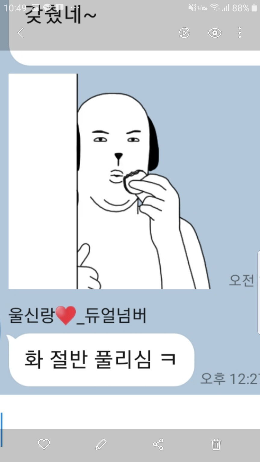 온종일 외면했던 스마트폰을 열어보니 남편의 톡이 와있다. 남편은 고부간 중간자 역할을 잘하는 편인데 하루 종일 어머니를 도우며 화를 반 정도 풀어드렸다고 으쓱해한다. 싸릉한다. 오늘은 '남'의 '편'이 아니구나. 최소한의 팀워크는 있는 양반이었구려.