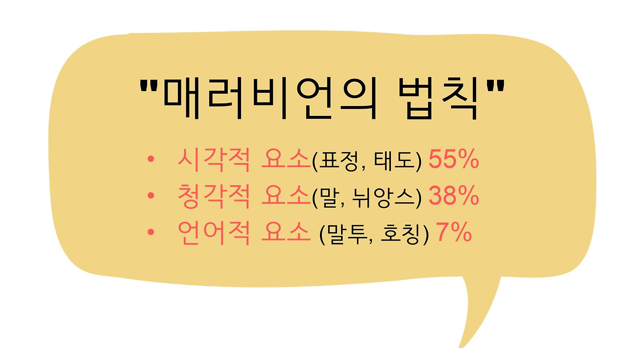 '매러비언의 법칙'이란 미국의 언어학자 앨버트 메러비언의 이름에서 따온 것으로 사람의 첫인상을 구상하는 여러 요소 중 시각적 요소(용모, 표정, 제스처), 청각적 요소(발음, 억양, 톤)의 비언어적 요소가 93% 언어적 요소(말의 내용과 메시지)는 7%를 차지한다는 이론이다.