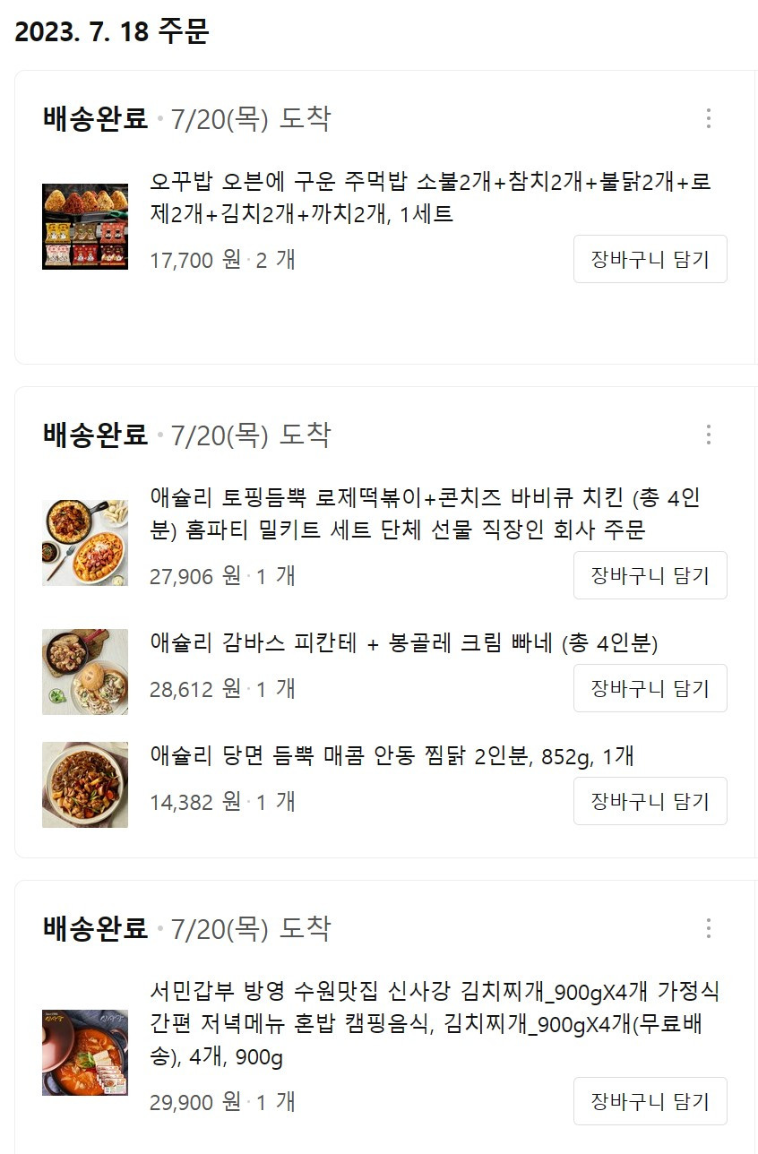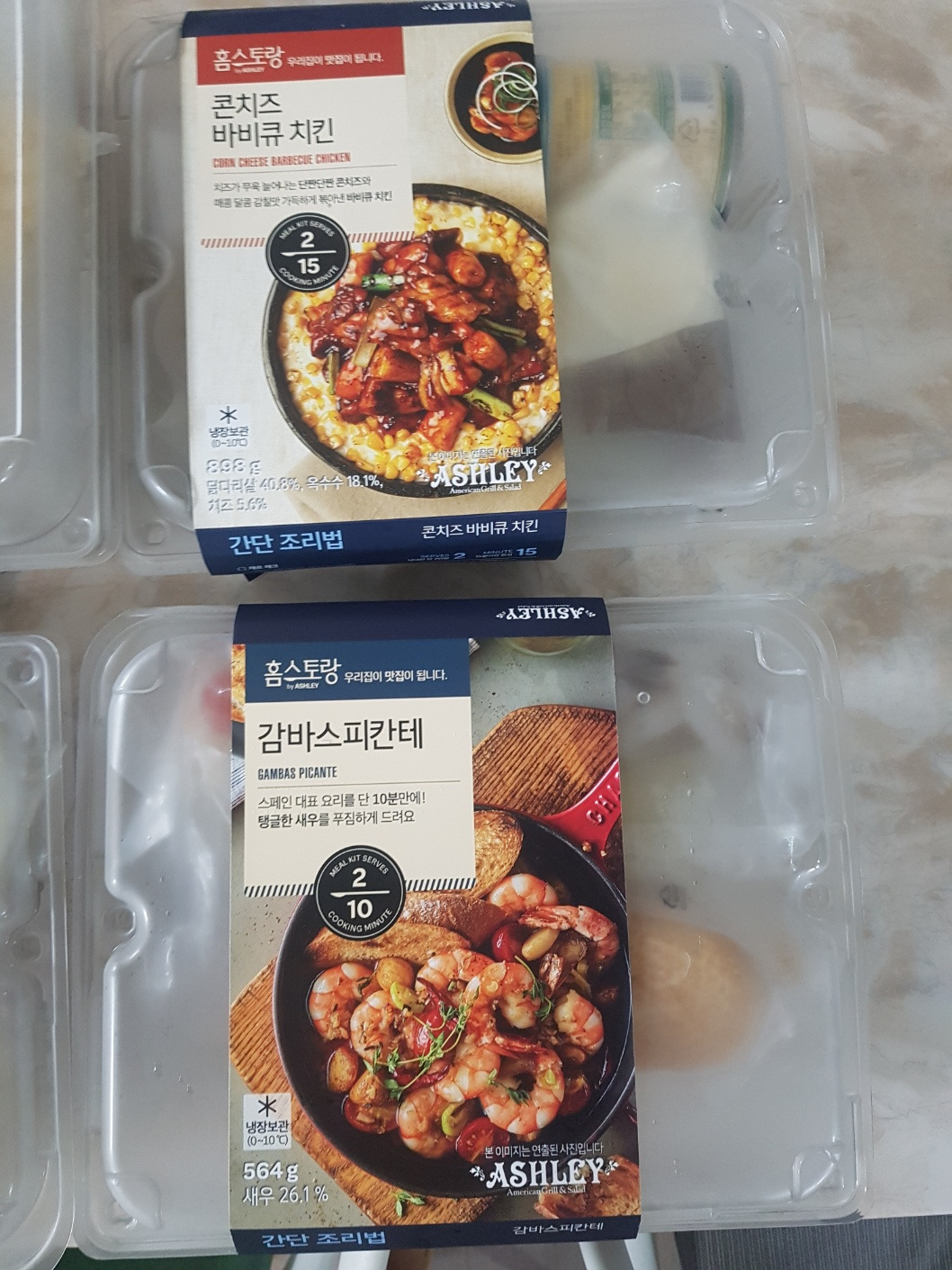 남편은 메뉴를 보더니 다 부인이 좋아하는 거 시켰다고 했다. 편의점 삼각김밥에 빠져 있는 아이들을 위해 비상식량으로 삼각 김밥을 주문하고 국 종류를 좋아하는 남편을 위해 김치찌개를 주문해 봤다. 김칫국이나 찌개 정도야 금방 할 수 있지만 캠핑 때 가져갈 수 있다고 생각하고 장바구니에 넣었다. 나머지 메뉴는 애슐리 메뉴로 당기는 대로 주문해 보았다. 장바구니가 가득 찰수록 마음이 편안해지고 왠지 모르게 든든해졌다. 시원하게 결제 버튼을 누르면서 소비의 기쁨도 만끽했다.